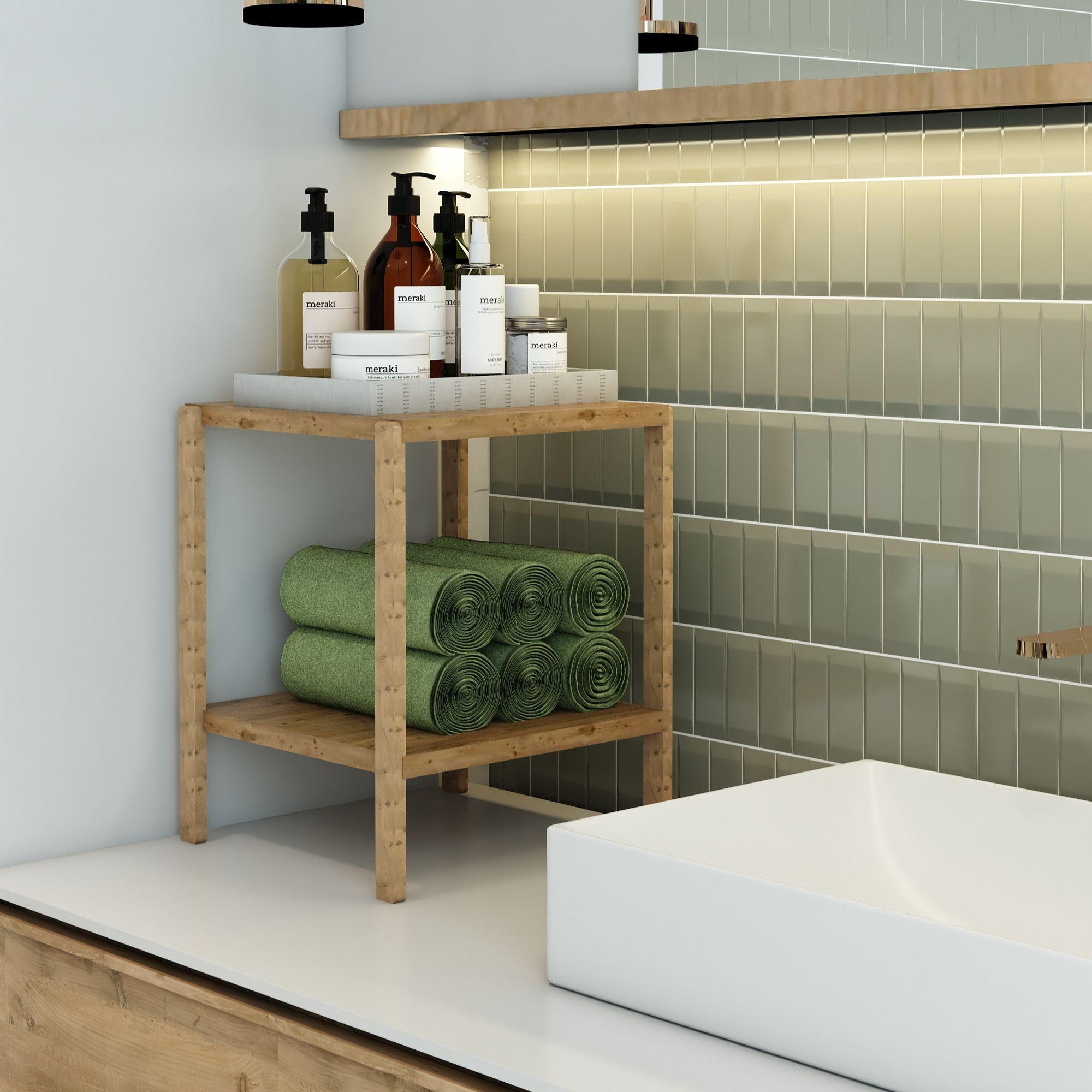 Modern iç mekân dekorasyonuna uyum sağlayan ahşap görünümlü ayaklar ve Atlantik Çam raf yüzeyleri, hem doğal hem de çağdaş bir atmosfer yaratır.