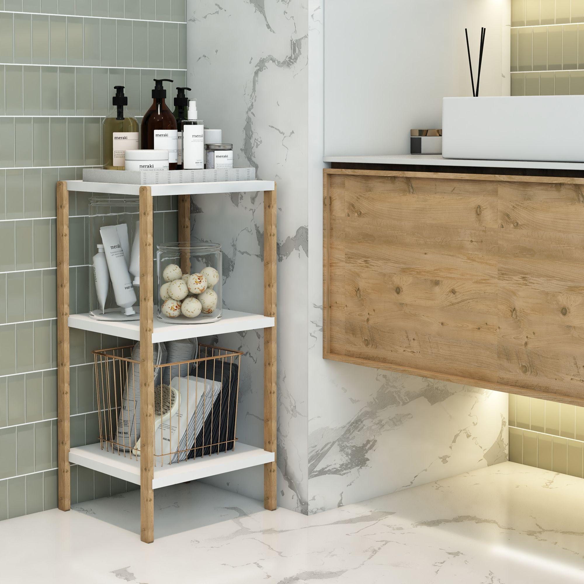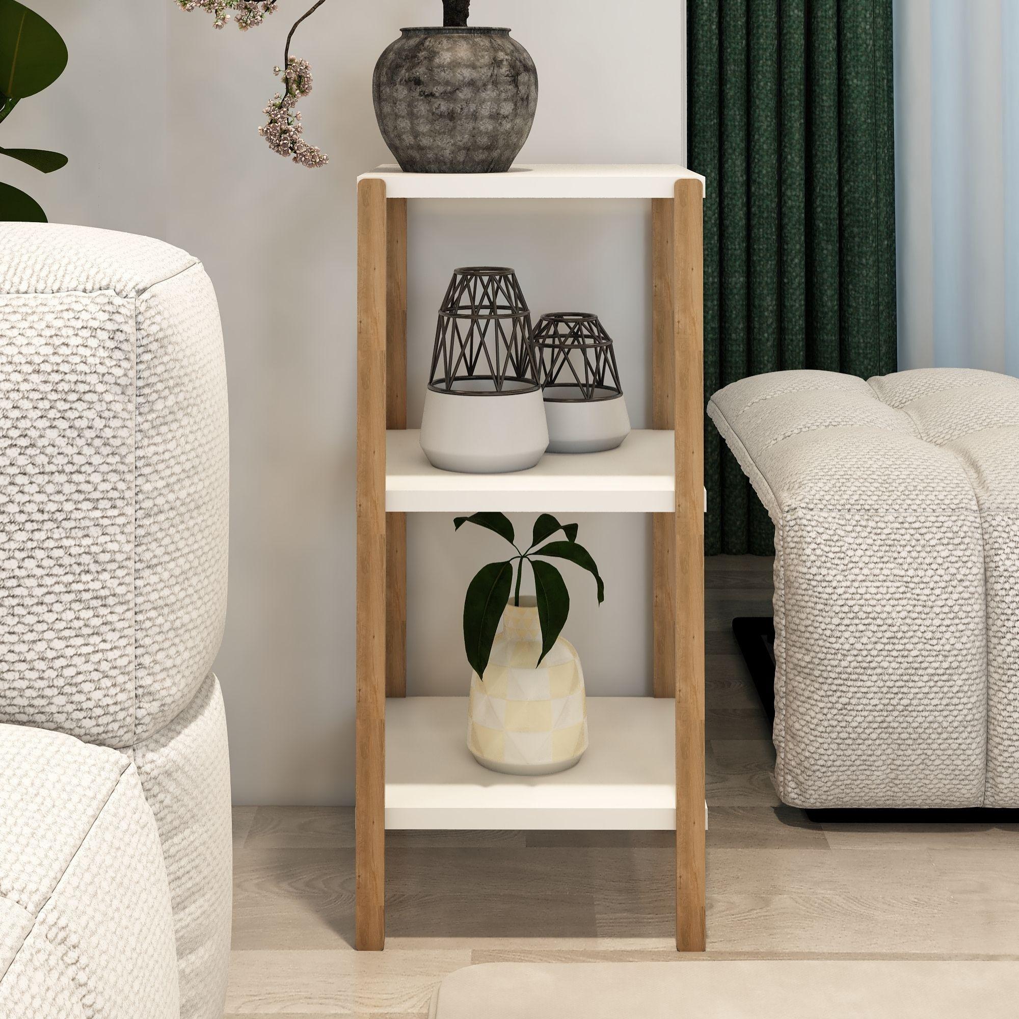 Modern iç mekân dekorasyonuna uyum sağlayan ahşap görünümlü ayaklar ve Beyaz raf yüzeyleri, hem doğal hem de çağdaş bir atmosfer yaratır.