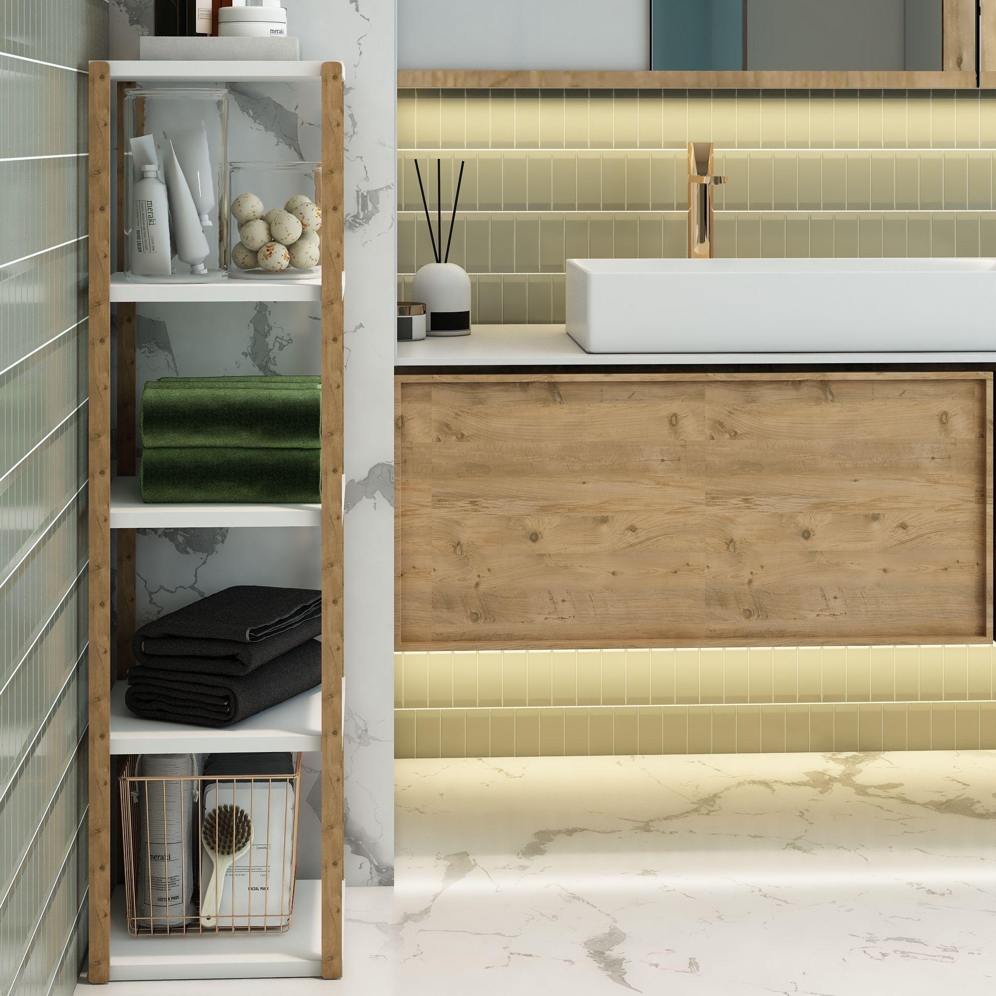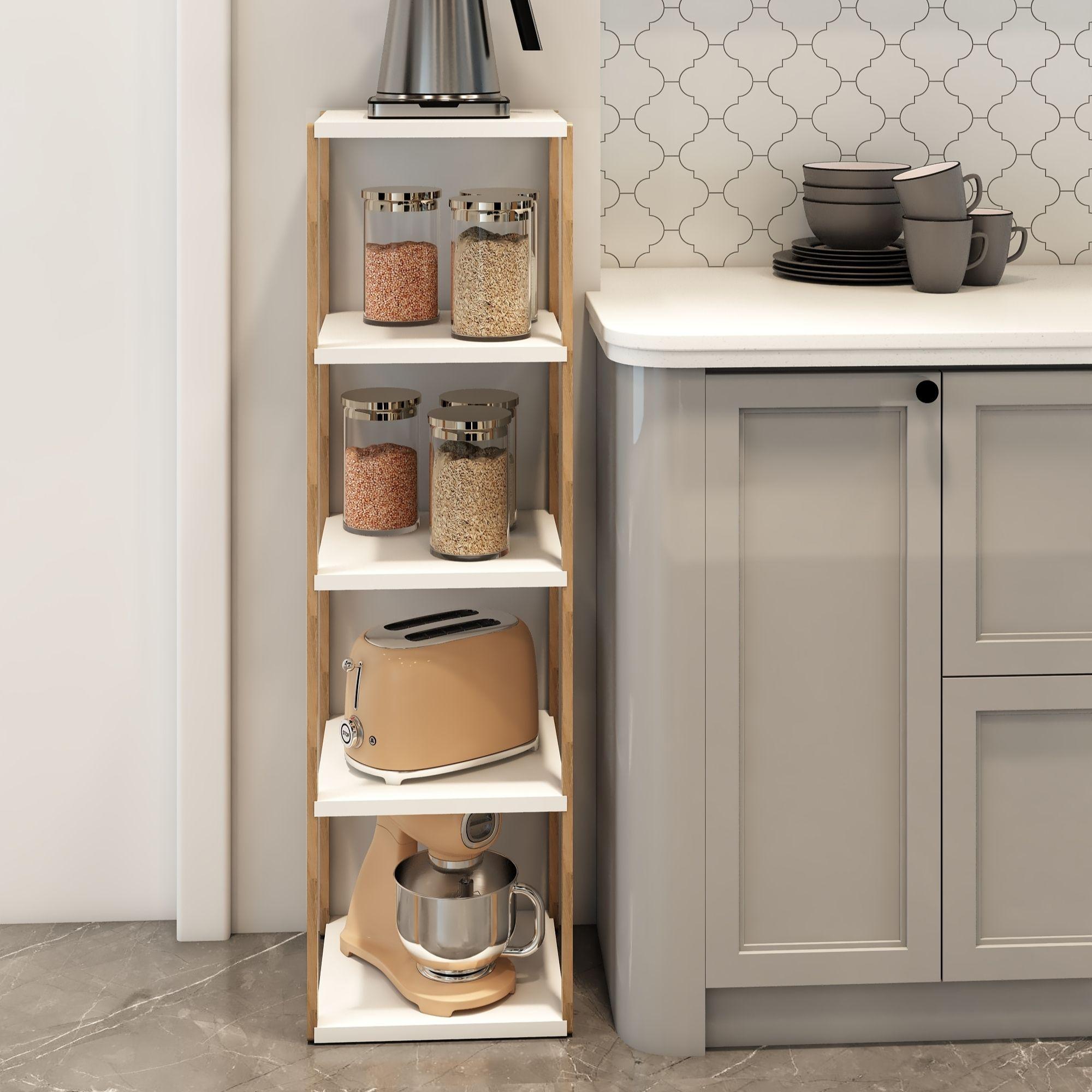 Dayanıklı gövde yapısı uzun süreli kullanım için idealdir. Doğal görünümlü ahşap ayakları ve sade Beyaz raf yüzeyleriyle her dekorasyon tarzına kolayca uyum sağlar.