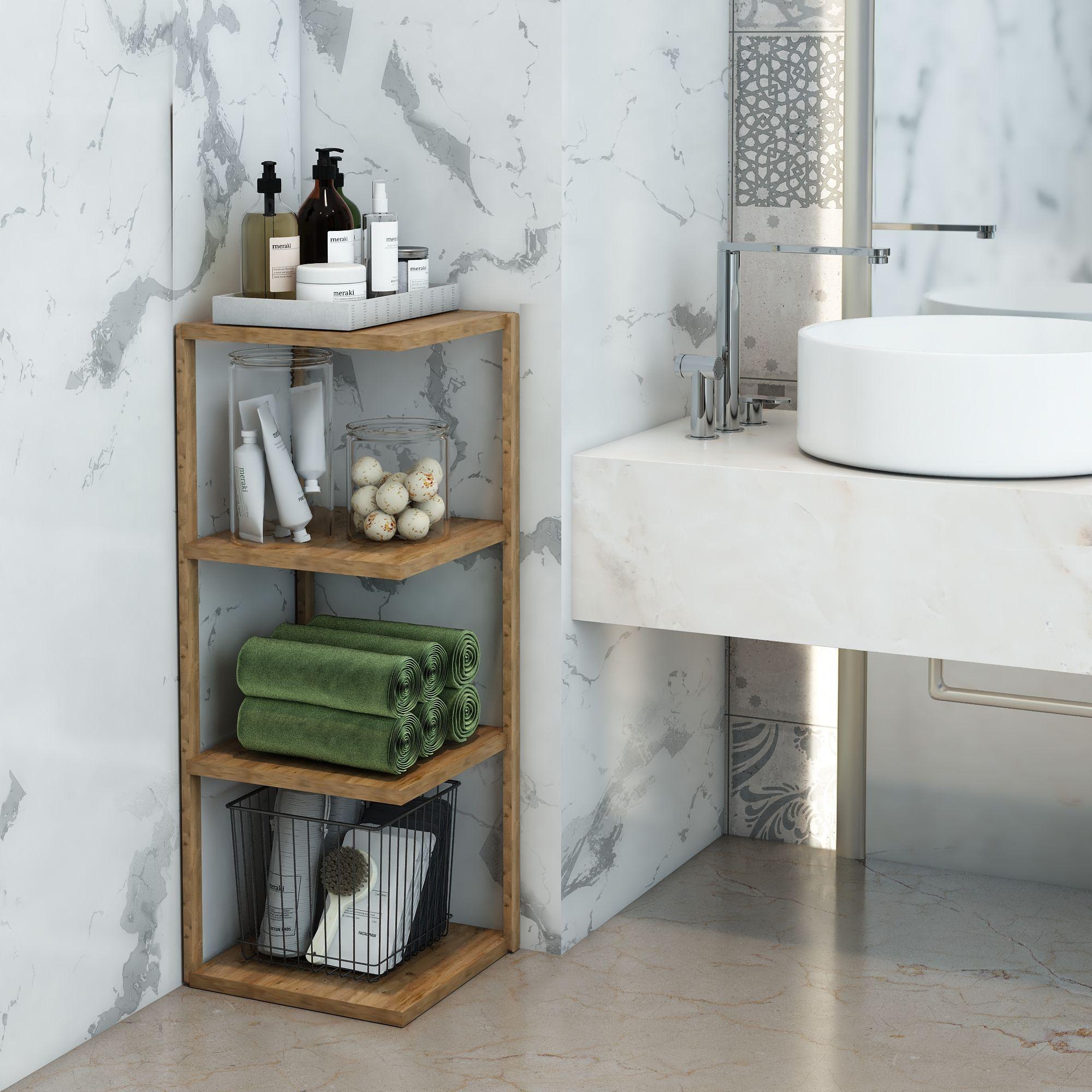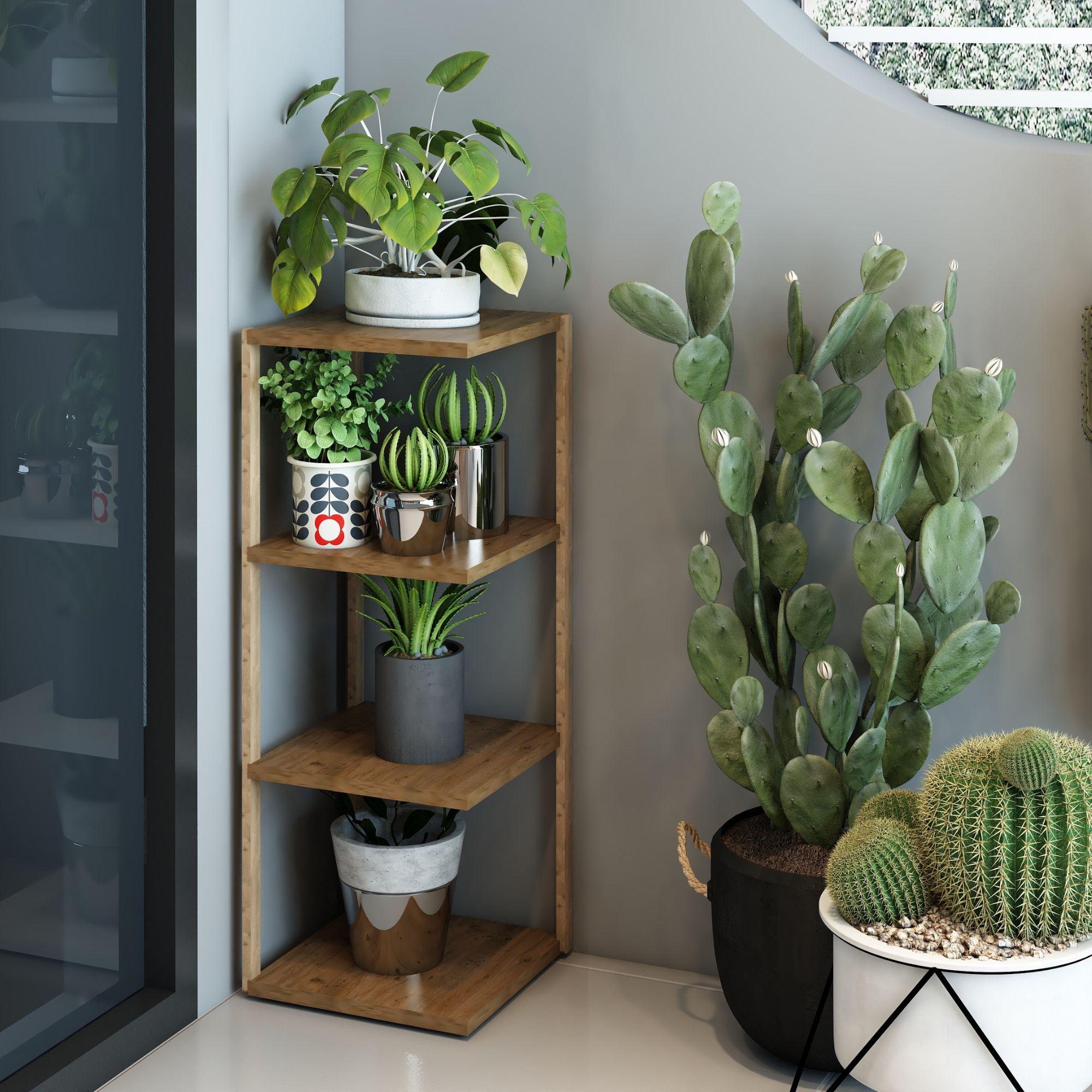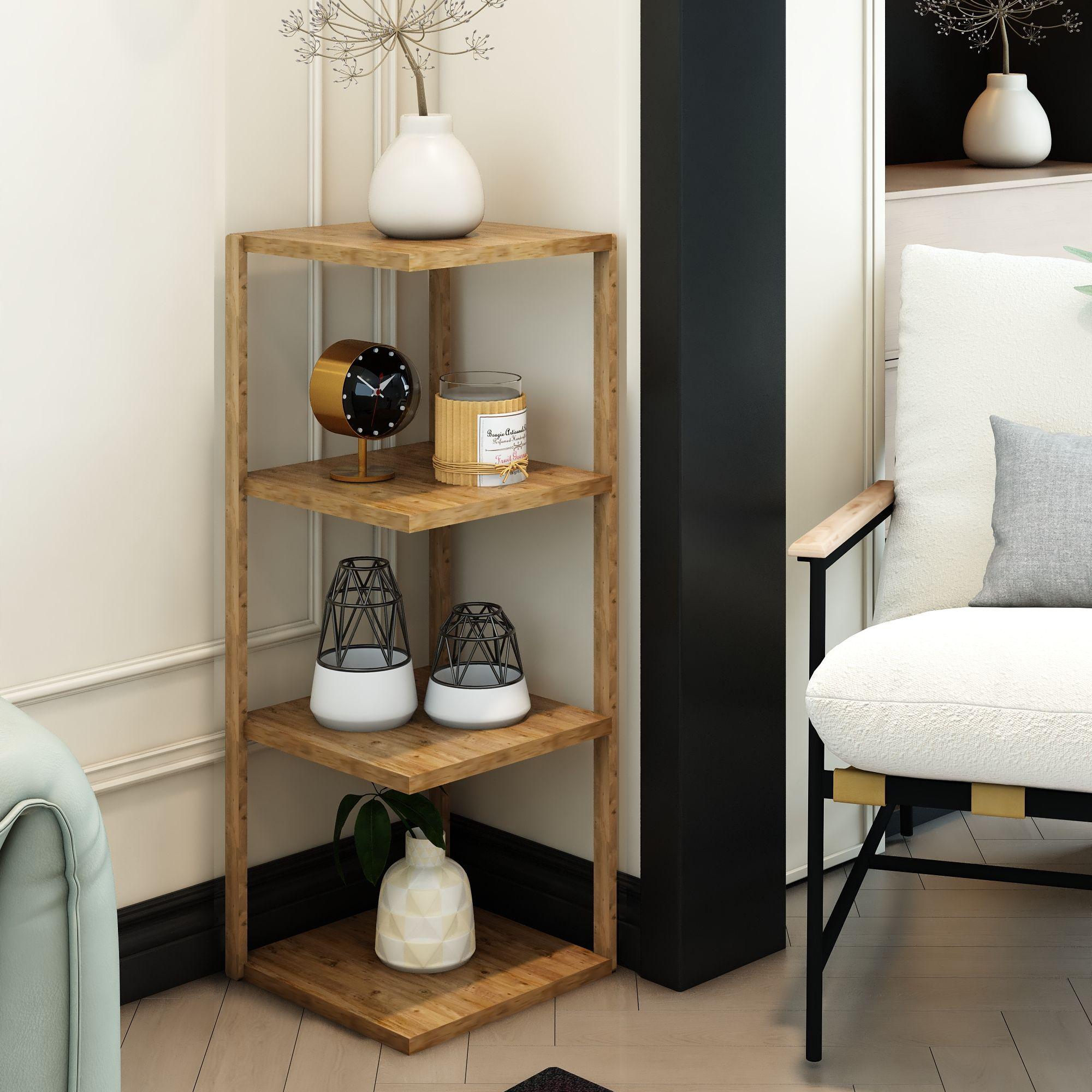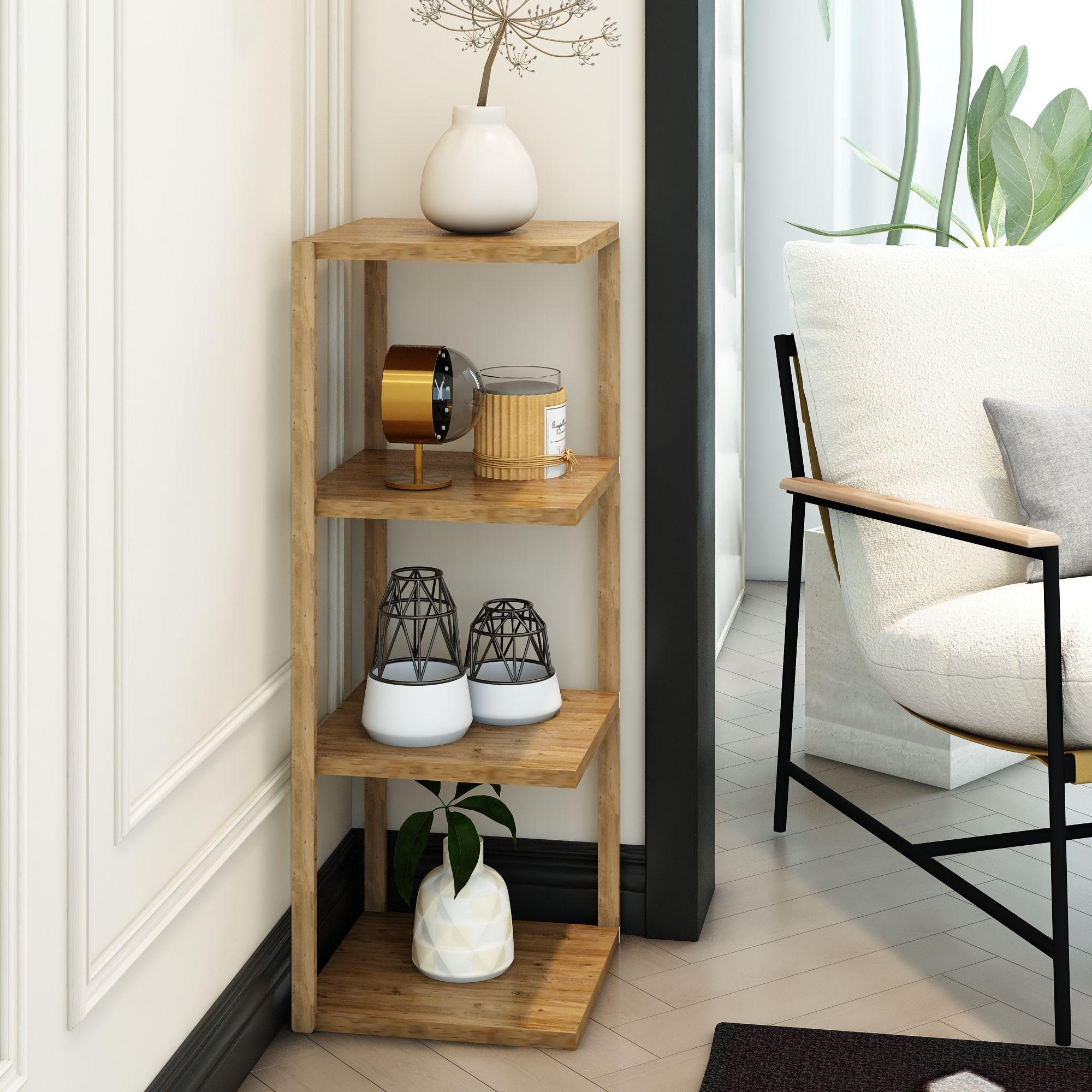 Devin 4 Katlı Atlantik Çam Ahşap Köşe Sehpası / Çok Amaçlı Dekoratif Raf, Saksı Standı, Çiçeklik / Mutfak Rafı, Baharatlık / Banyo Rafı