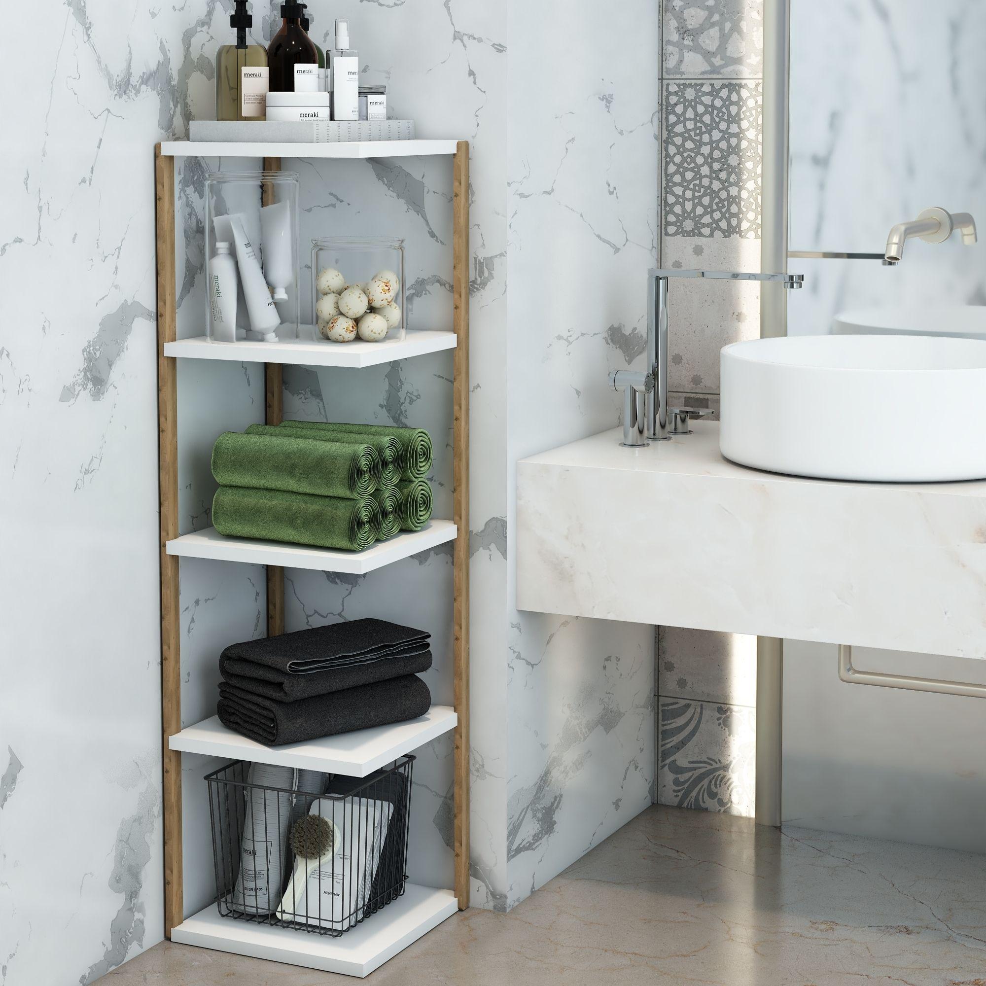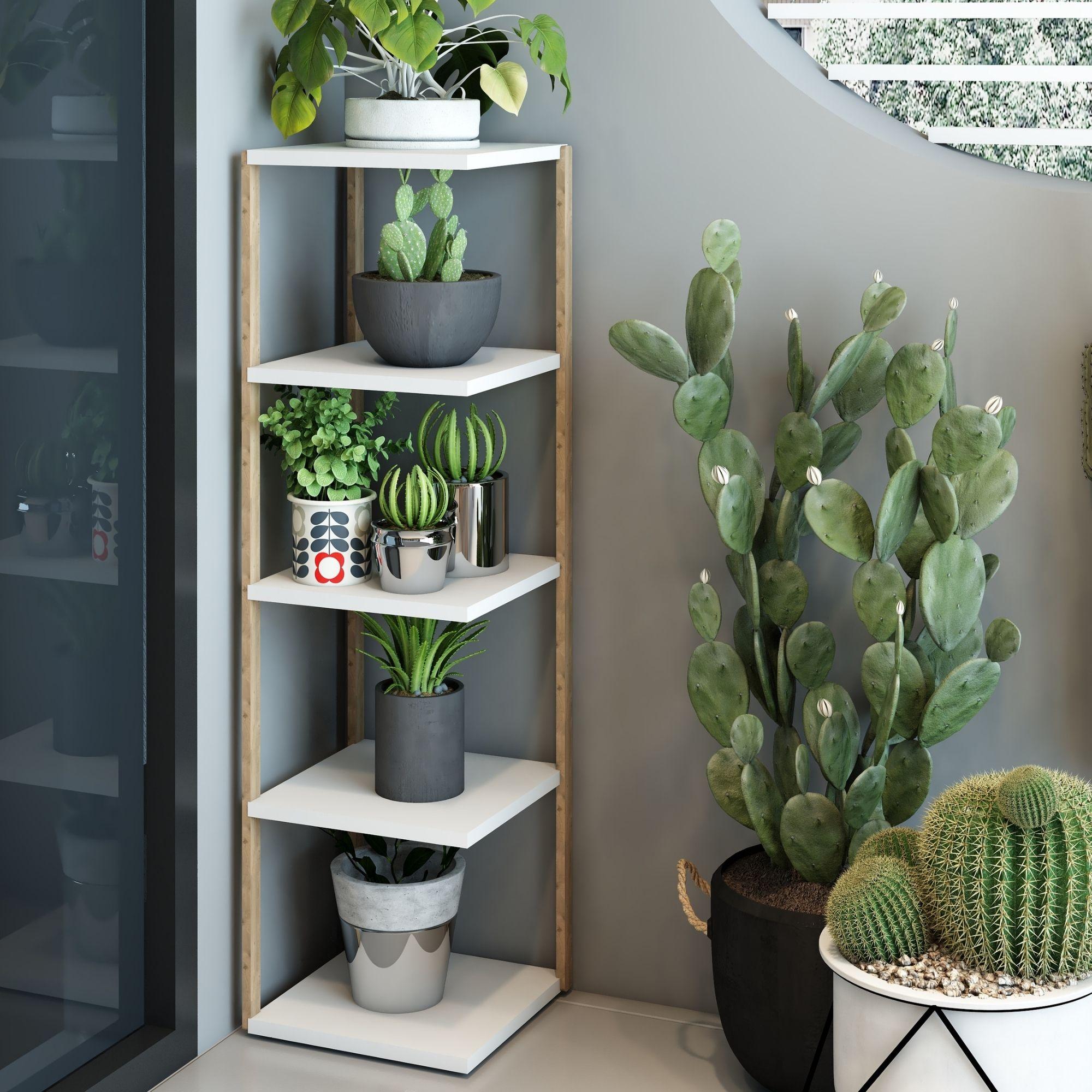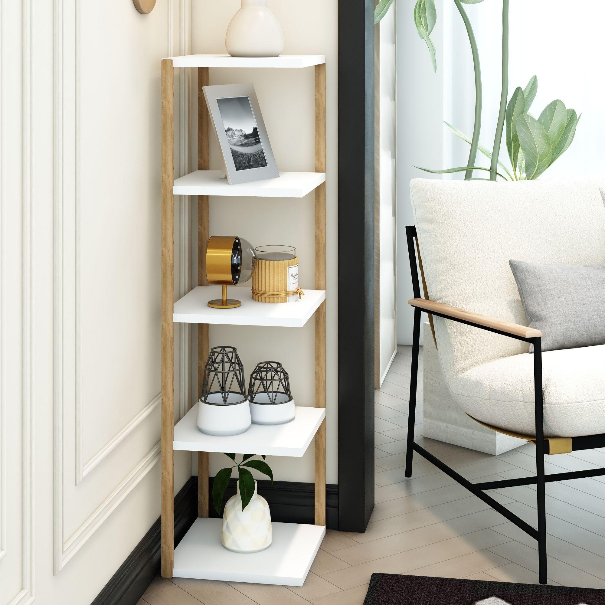 Devin 5 Katlı Beyaz Ahşap Köşe Sehpası / Çok Amaçlı Dekoratif Raf, Saksı Standı, Çiçeklik / Mutfak Rafı, Baharatlık / Banyo Rafı