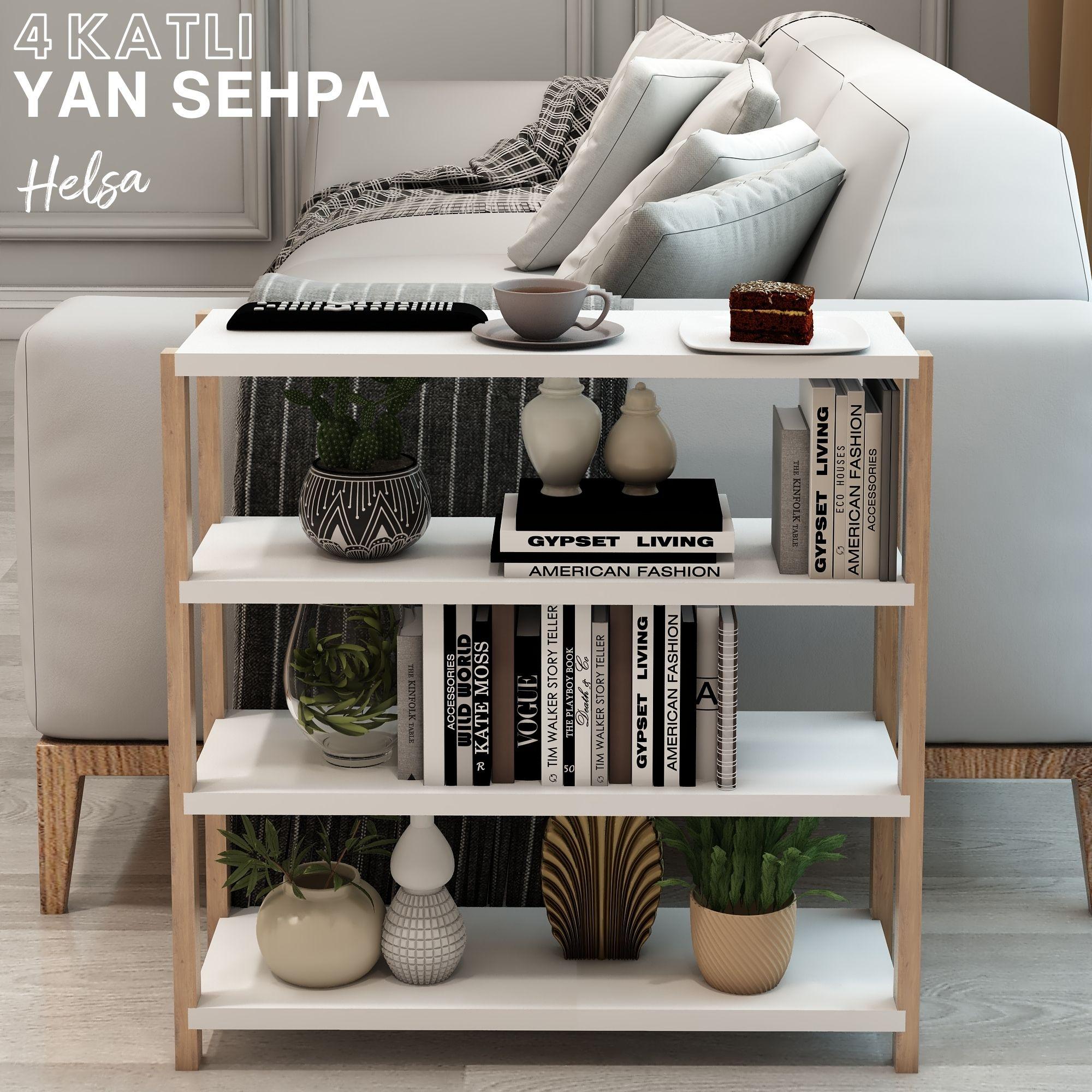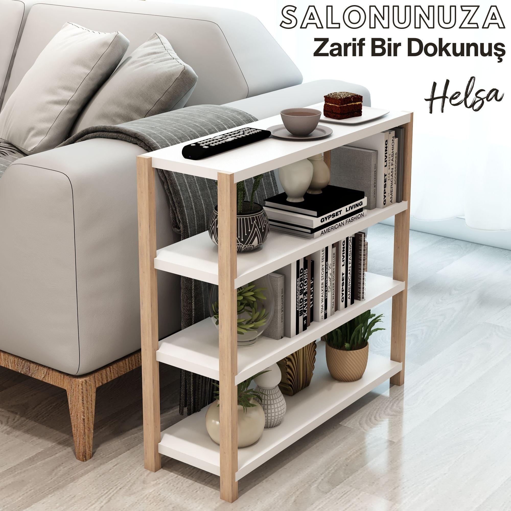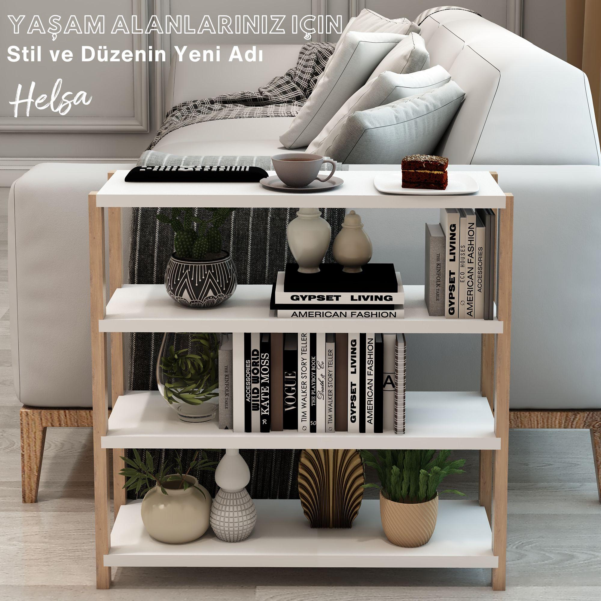 Jest Dekor Konsept Helsa 4 Raflı Ahşap Yan Sehpa, İhtiyacınız olan her yerde Yan Sehpa olarak kullanabilmenizin yanı sıra, kitaplık, banyo düzenleyici, mutfak rafı ve ofis organizeri olarak da kullanılabilecek çok amaçlı bir üründür.
