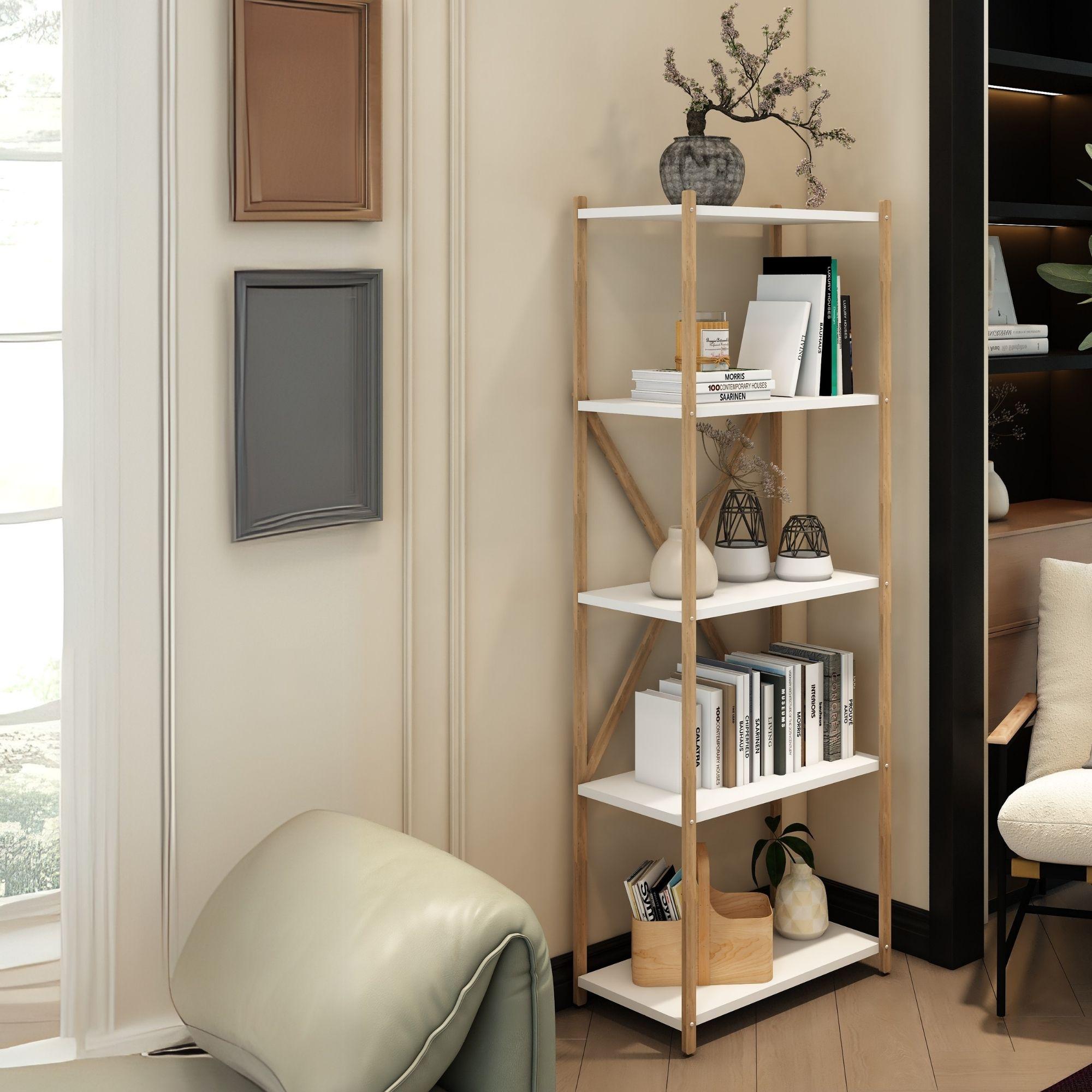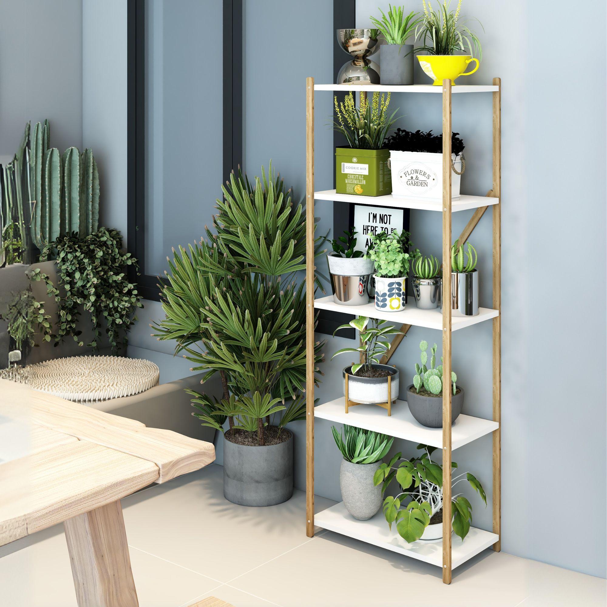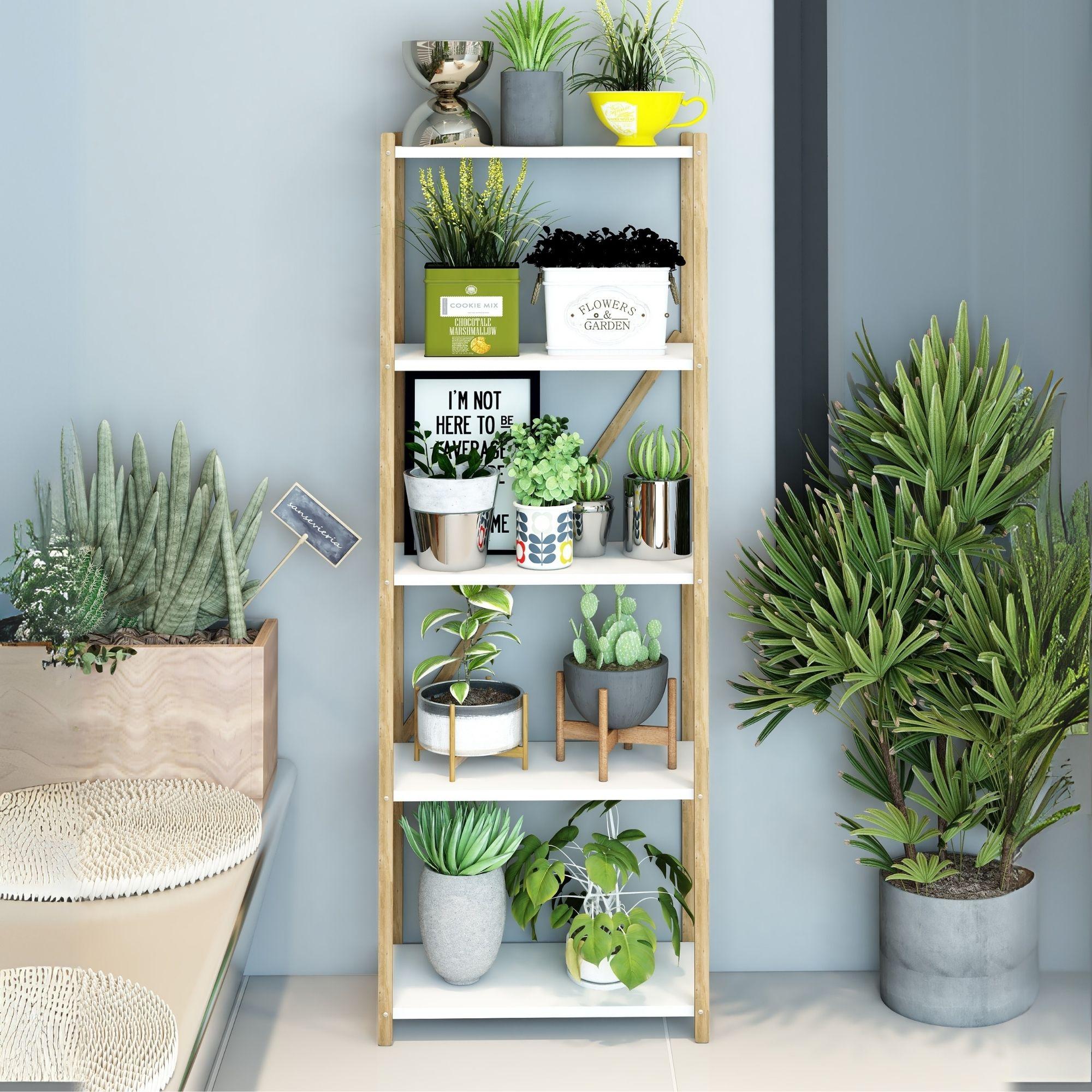 Karmen Beyaz 5 Katlı Çok Amaçlı Ahşap Dekoratif Raf / Kitaplık & Düzenleyici & Saksı Standı, Çiçeklik