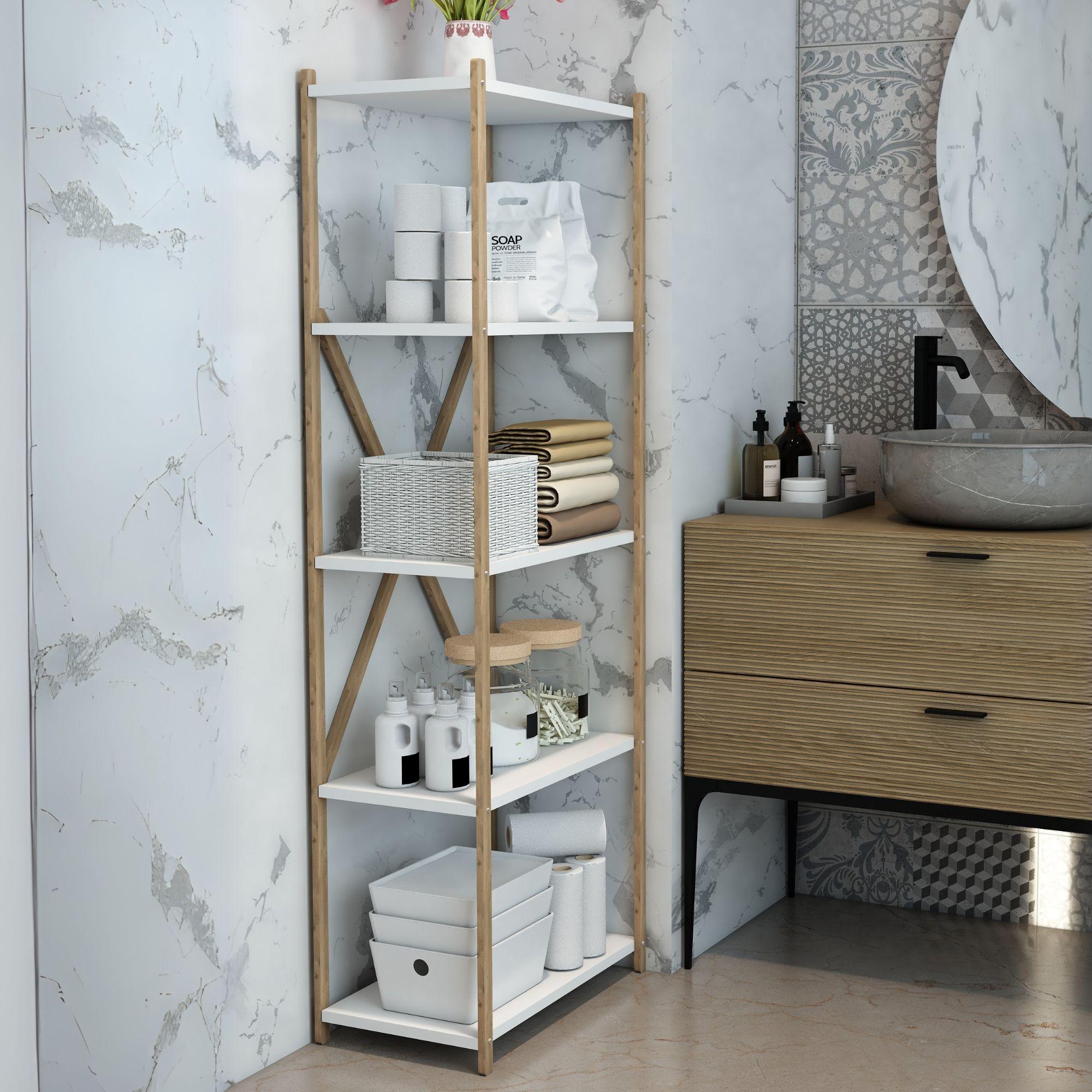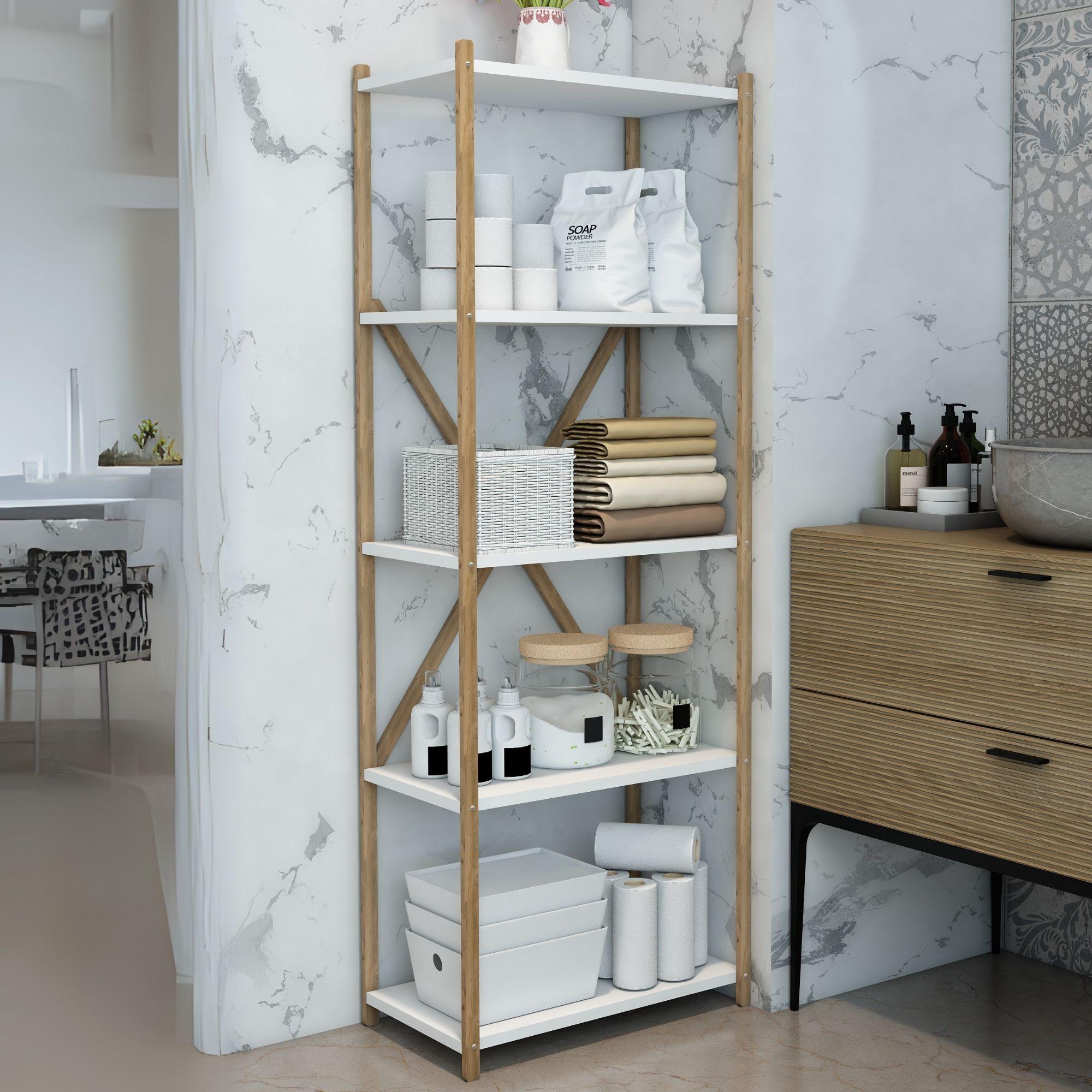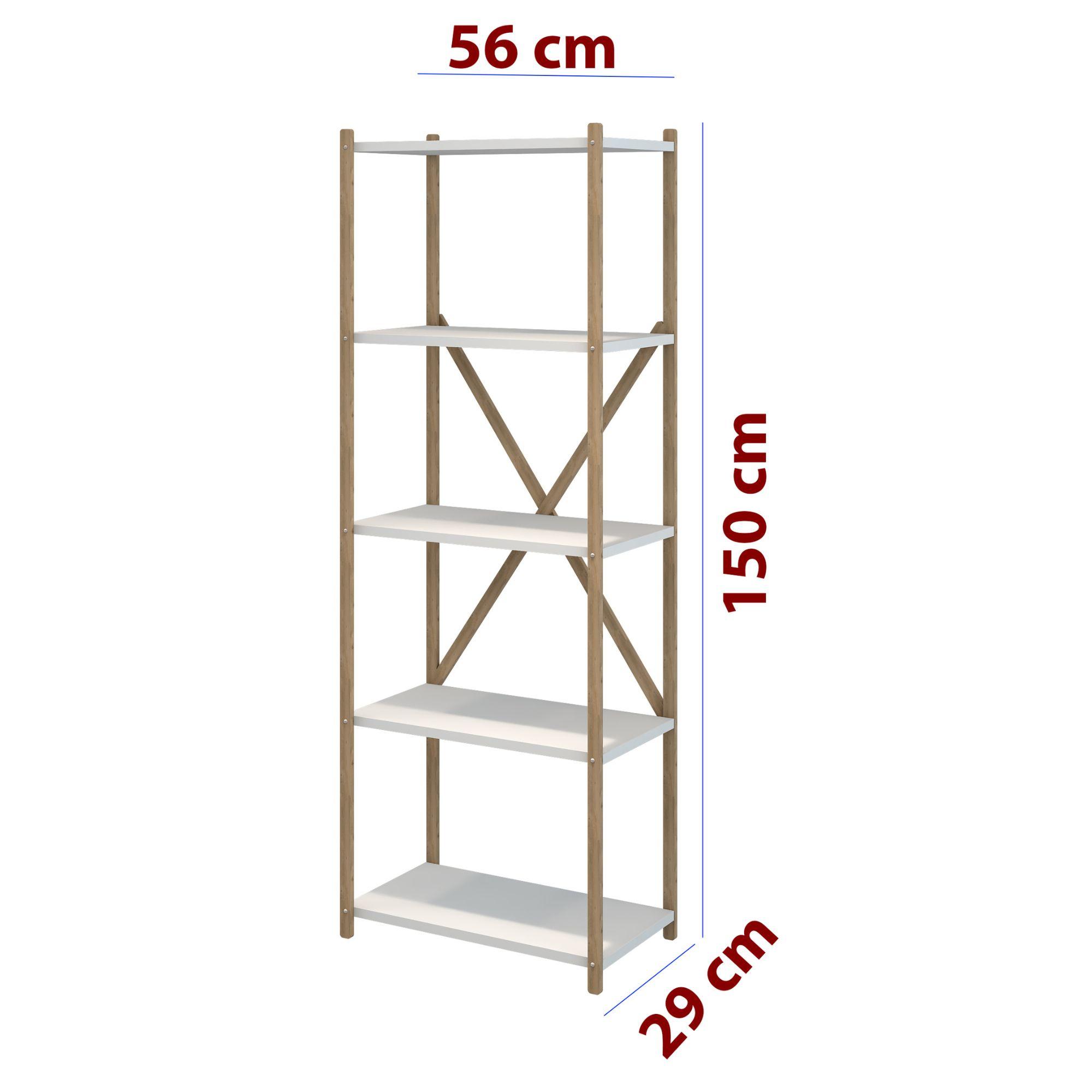 Sağlam doğal ahşap ayak yapısı ve Beyaz renkli raflarıyla hem sıcak hem modern bir atmosfer oluşturur. Raf aralıkları, farklı boyutlardaki ürünleri yerleştirmek için idealdir. Kitap, ev tekstili, banyo malzemeleri, mutfak ürünleri ya da bitkiler… Ne isterseniz onun için bir alan yaratır.