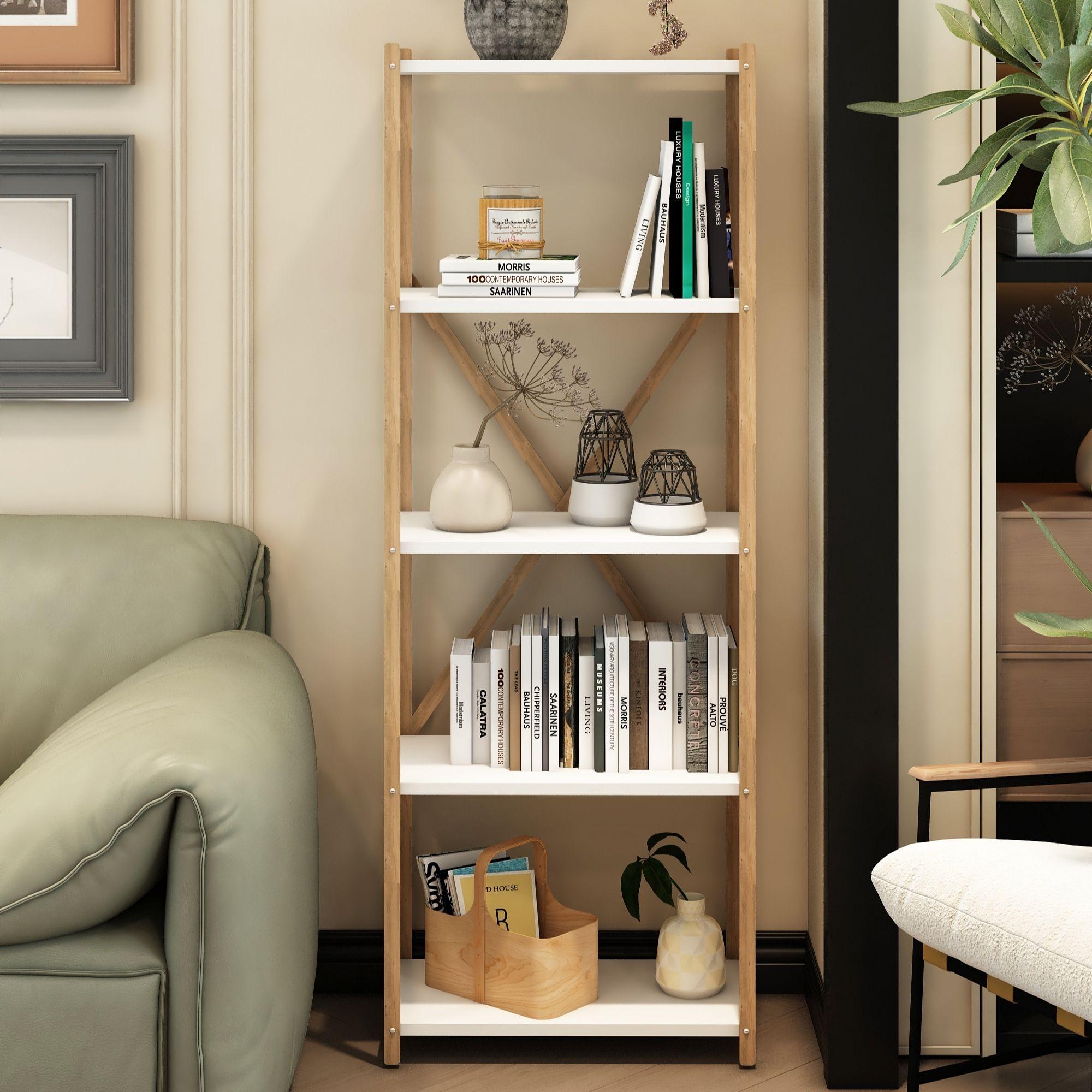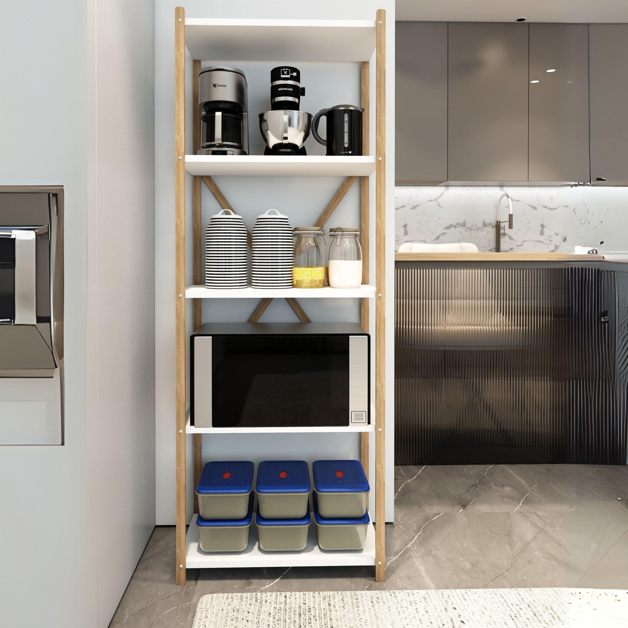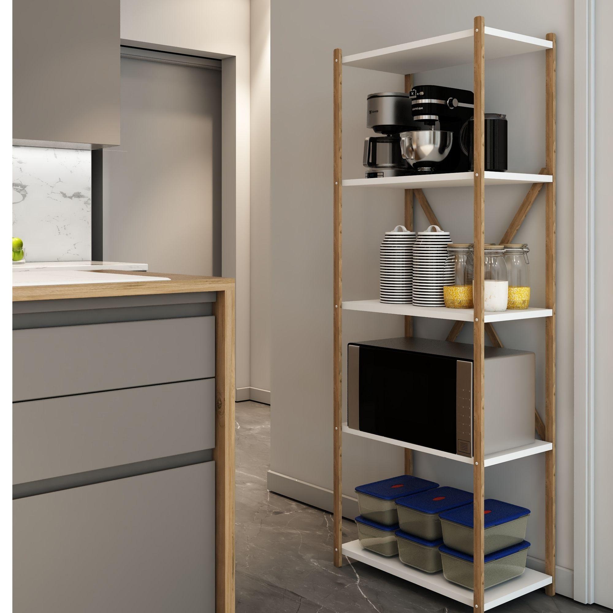 Sağlam doğal ahşap ayak yapısı ve Beyaz renkli raflarıyla hem sıcak hem modern bir atmosfer oluşturur. Raf aralıkları, farklı boyutlardaki ürünleri yerleştirmek için idealdir. Kitap, ev tekstili, banyo malzemeleri, mutfak ürünleri ya da bitkiler… Ne isterseniz onun için bir alan yaratır.