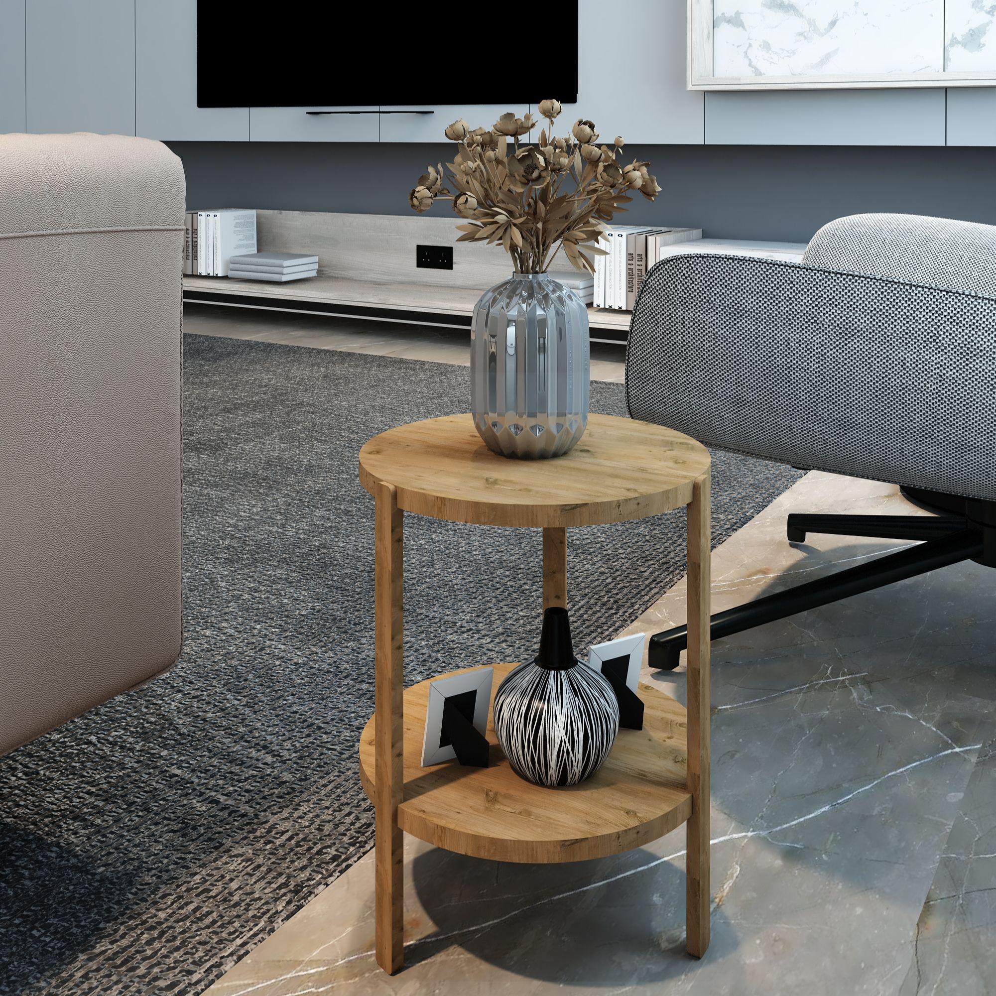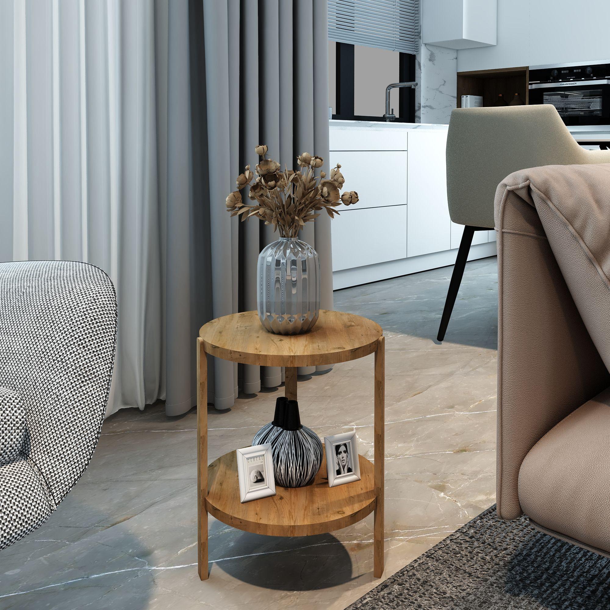 Jest Dekor Konsept Miray 2 Raflı Yuvarlak Çok Amaçlı Ahşap Sehpa, hem fonksiyonel hem de estetik tasarımıyla evin her köşesinde kullanabileceğiniz çok yönlü bir üründür. Yüksekliği 39 cm, genişliği 32,5 cm olan bu sehpa, zarif yuvarlak rafları ve 25 cm aralıkları sayesinde çeşitli dekoratif eşyaları sergilemek veya işlevsel kullanım seçenekleri sunuyor.