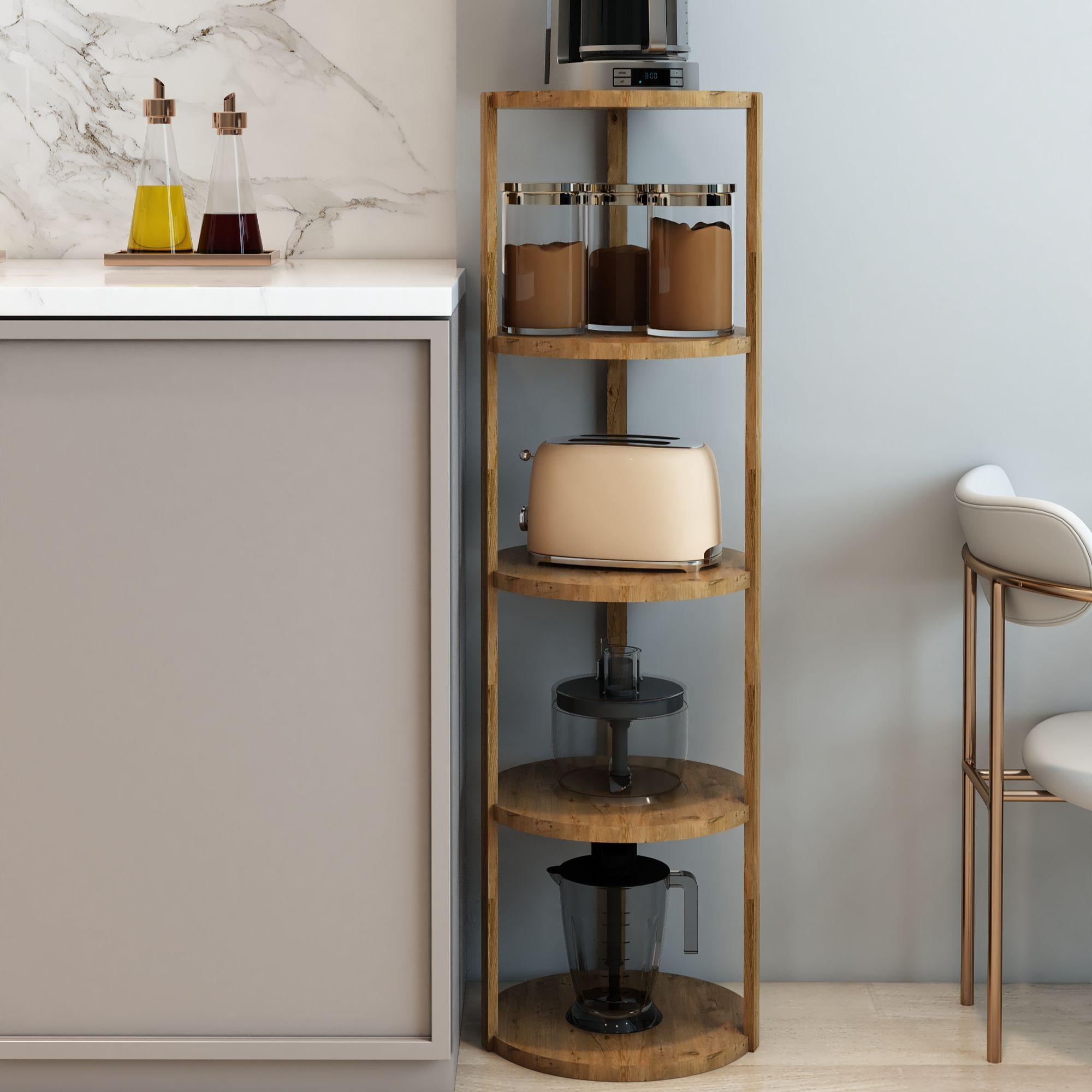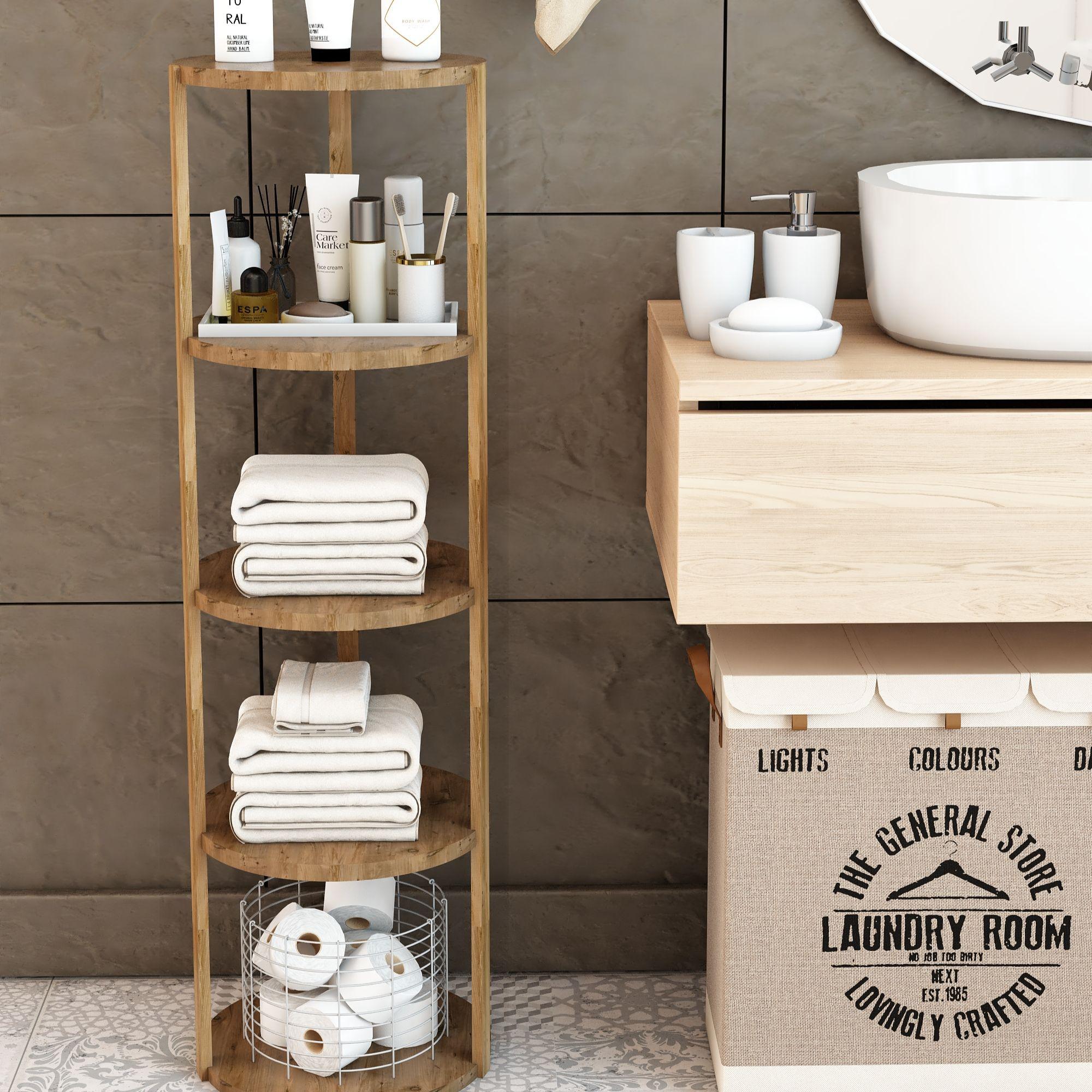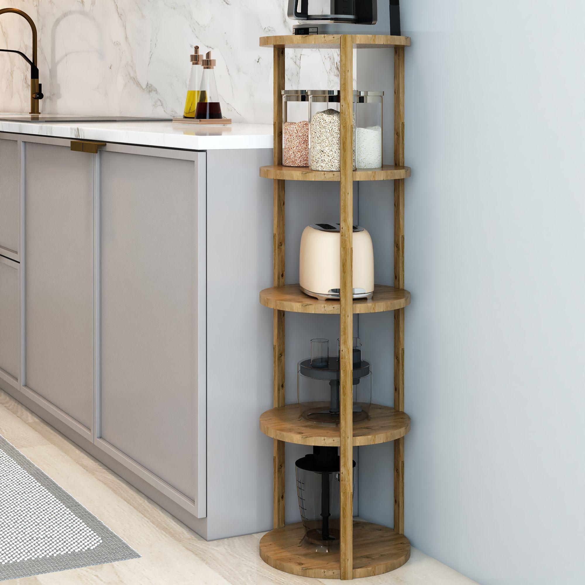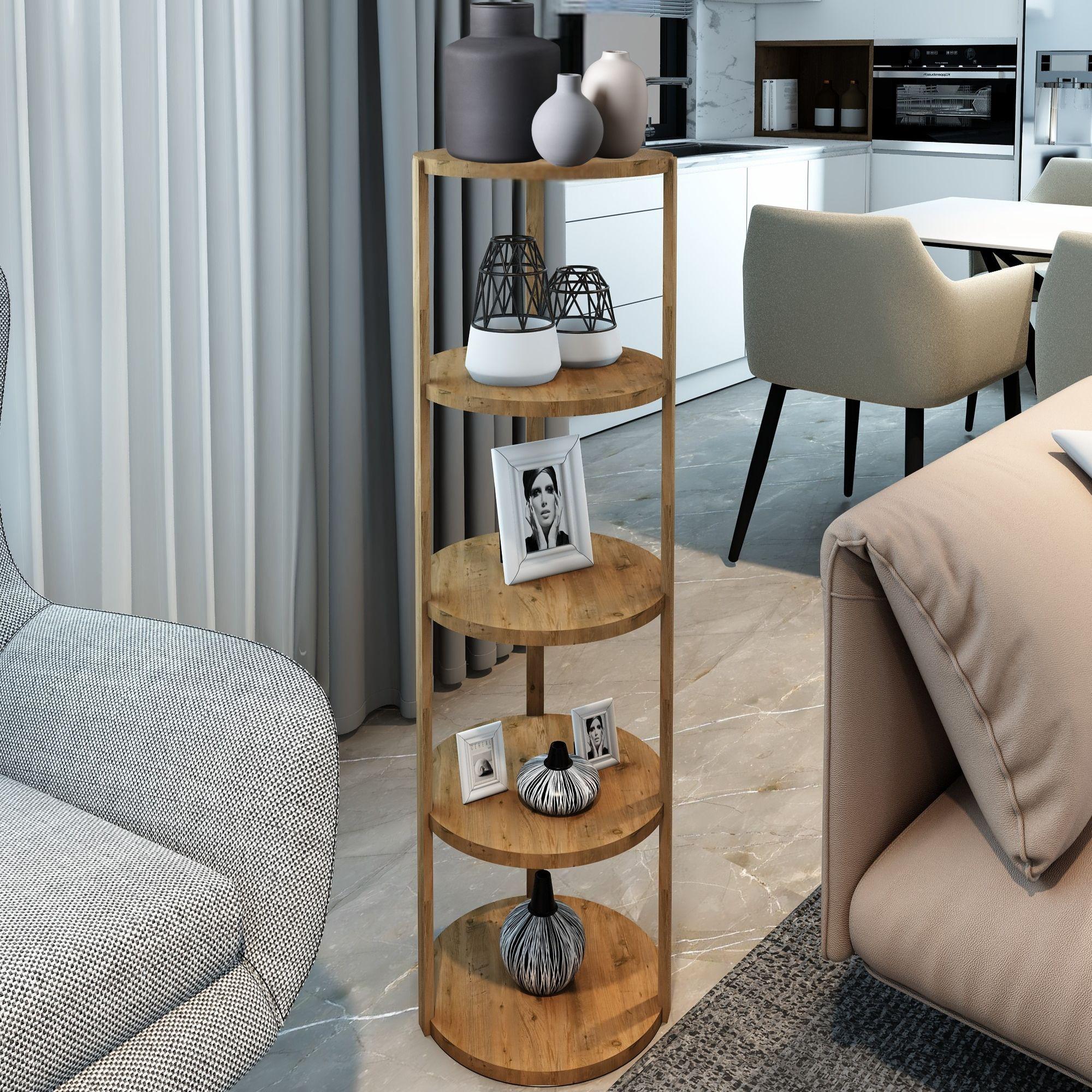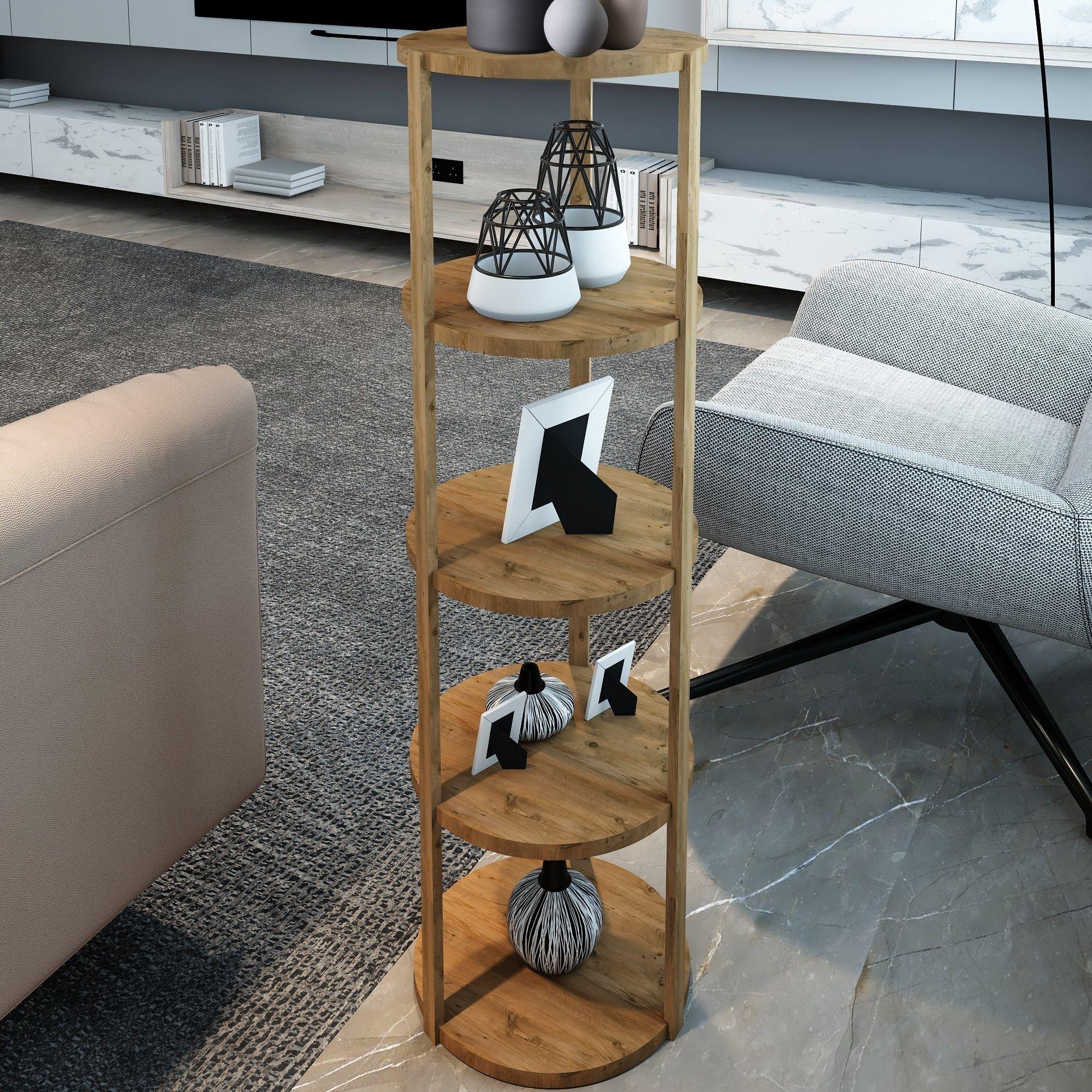 Jest Dekor Konsept Miray 5 Raflı Yuvarlak Çok Amaçlı Ahşap Sehpa, hem fonksiyonel hem de estetik tasarımıyla evin her köşesinde kullanabileceğiniz çok yönlü bir üründür. Yüksekliği 109 cm, genişliği 32,5 cm olan bu sehpa, zarif yuvarlak rafları ve 25 cm aralıkları sayesinde çeşitli dekoratif eşyaları sergilemek için veya işlevsel kullanım seçenekleri sunuyor.