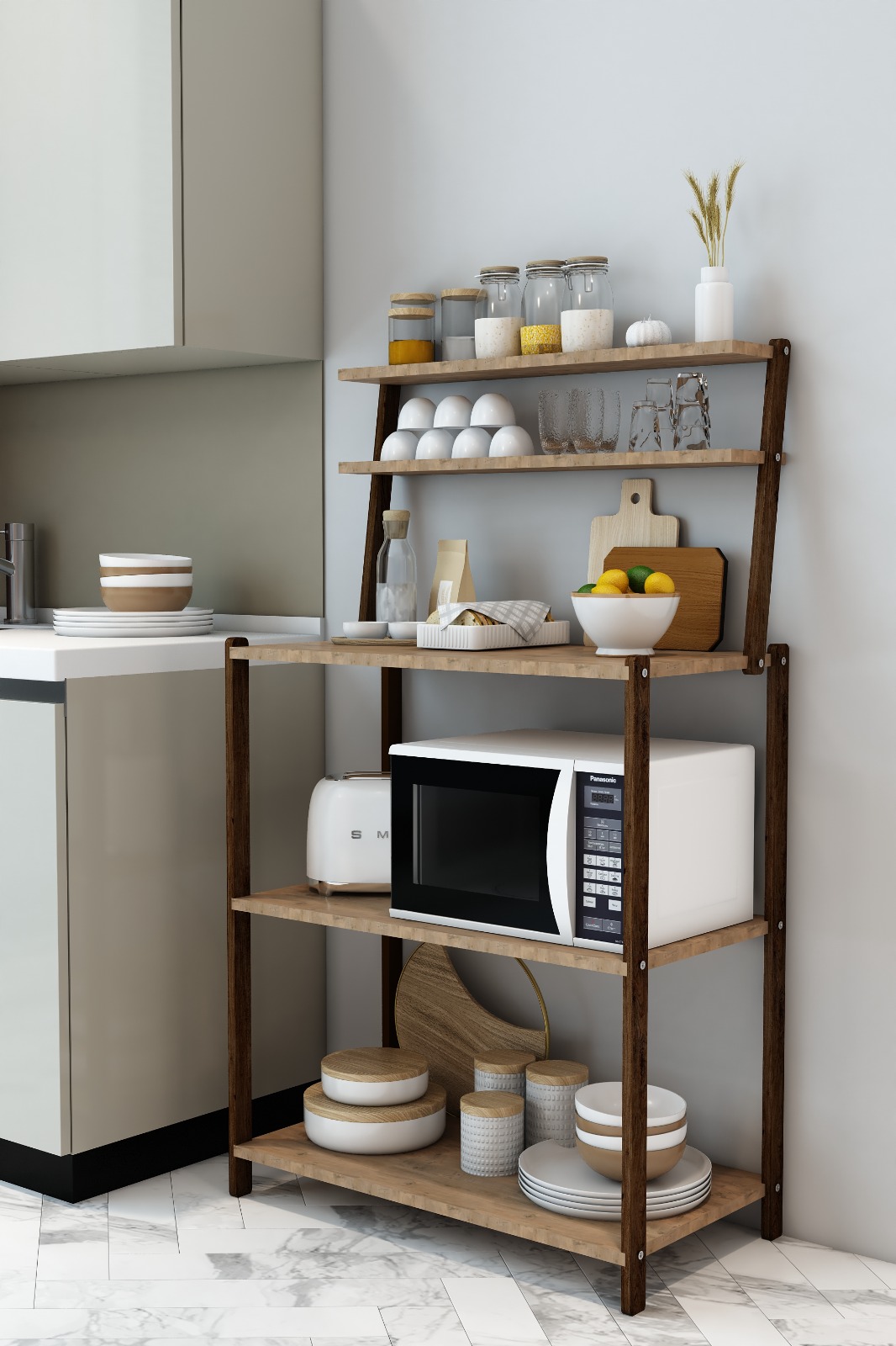 Mutfak Saklama Ünitesi: Tost makinesi, baharatlıklar, tabaklar ve mutfak aksesuarlarınız için geniş alan sağlar.