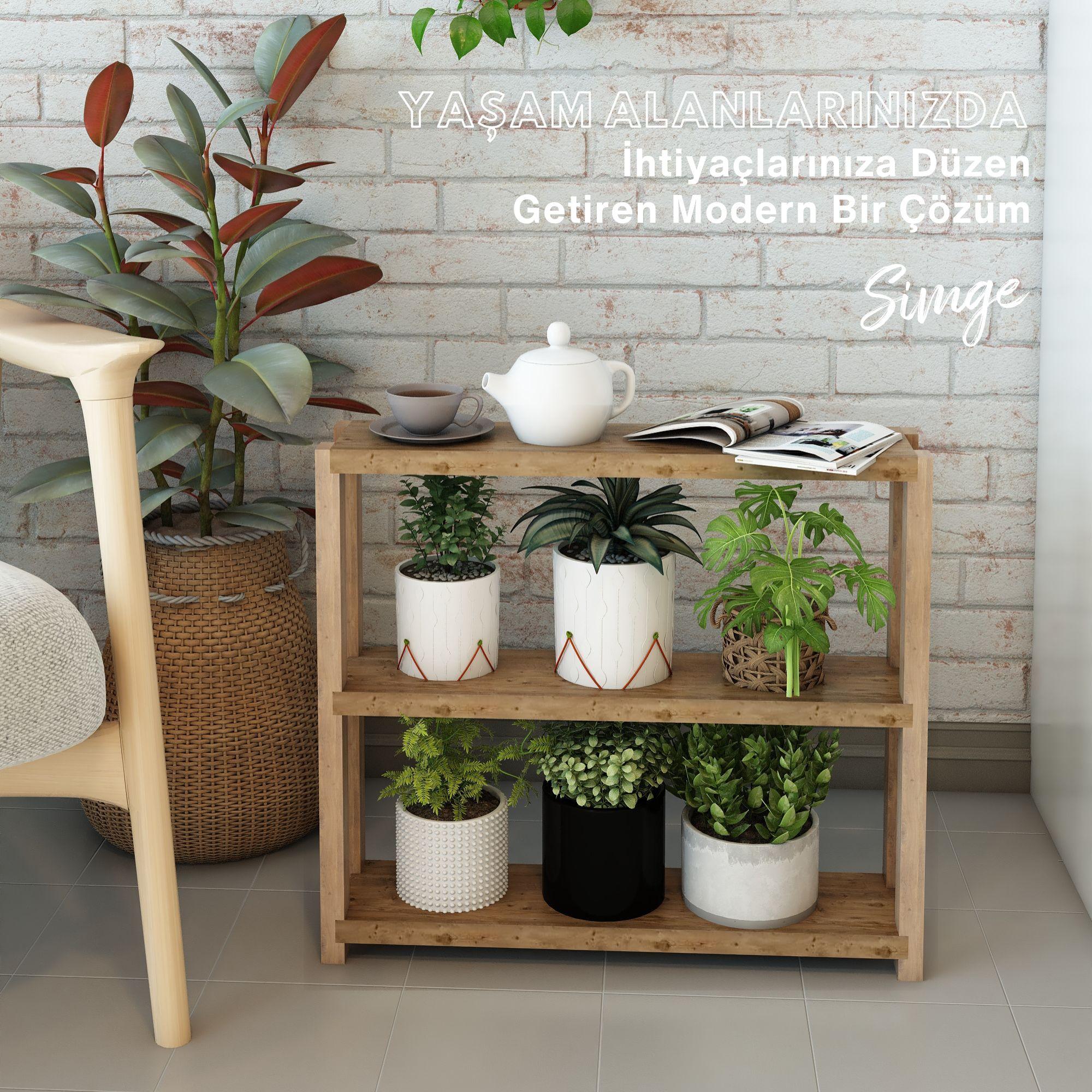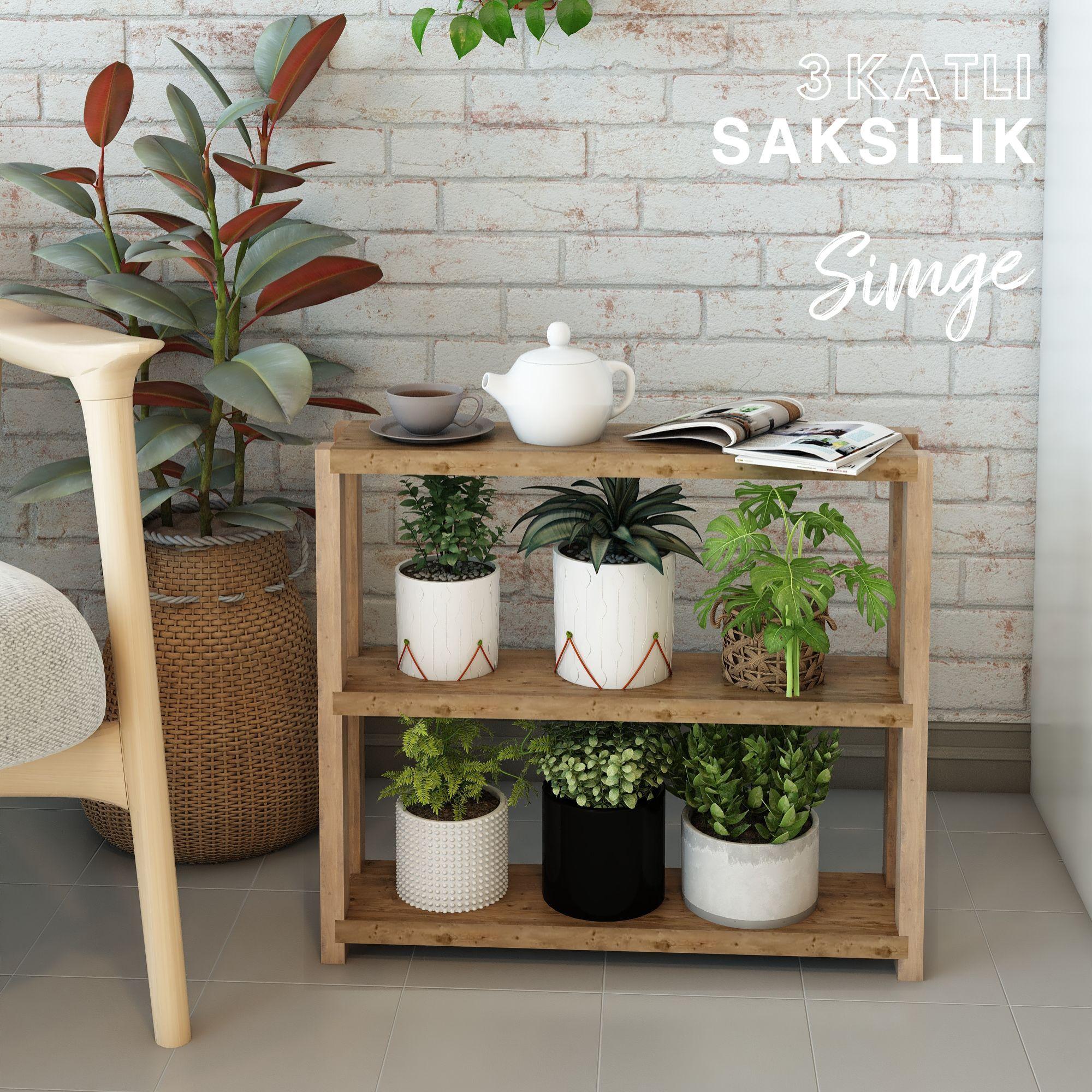 Simge 3 Katlı Ahşap Çiçeklik, Saksılık, Çiçek Standı / Dekoratif Raf / Çok Amaçlı Kullanım / Demonte ve Kolay Montaj