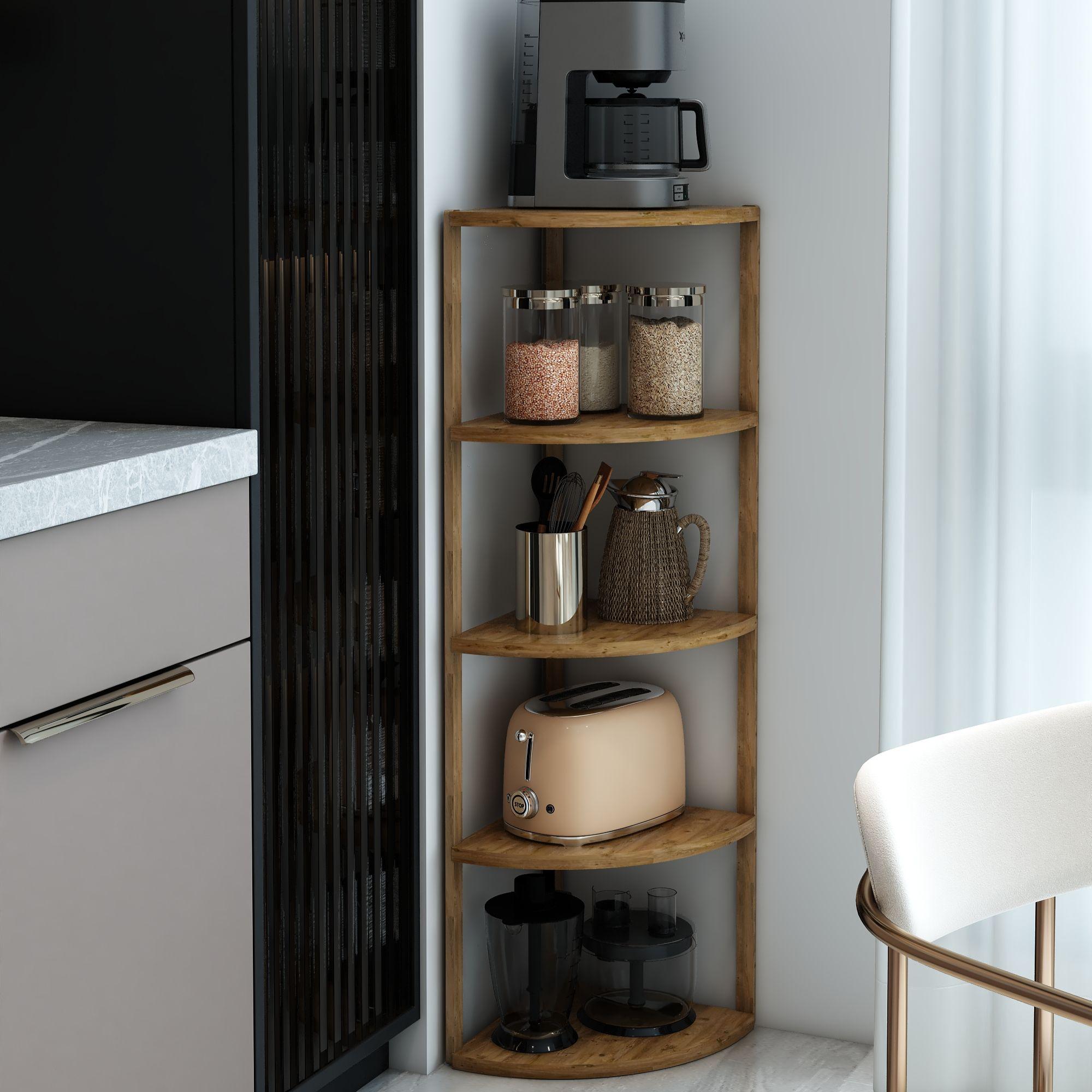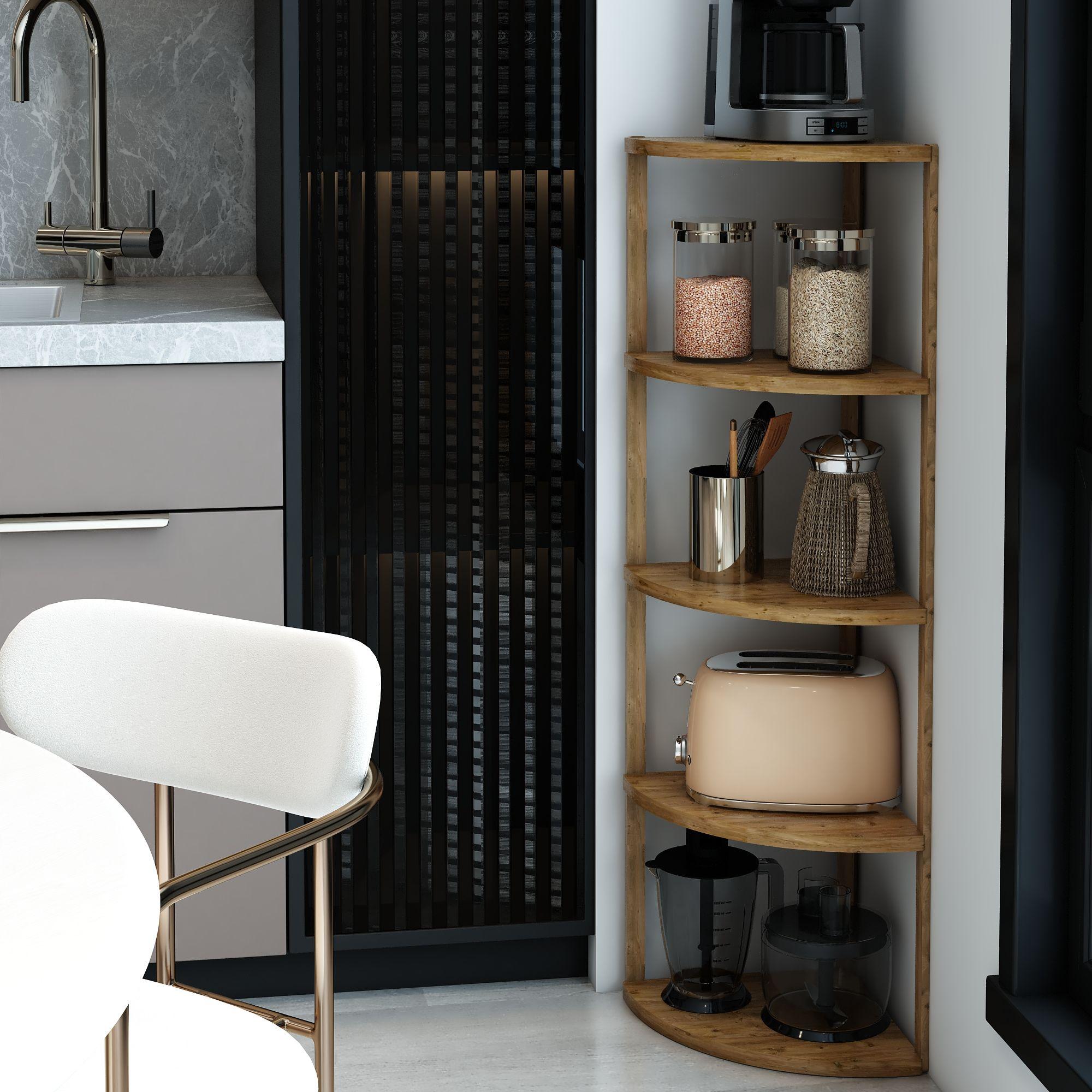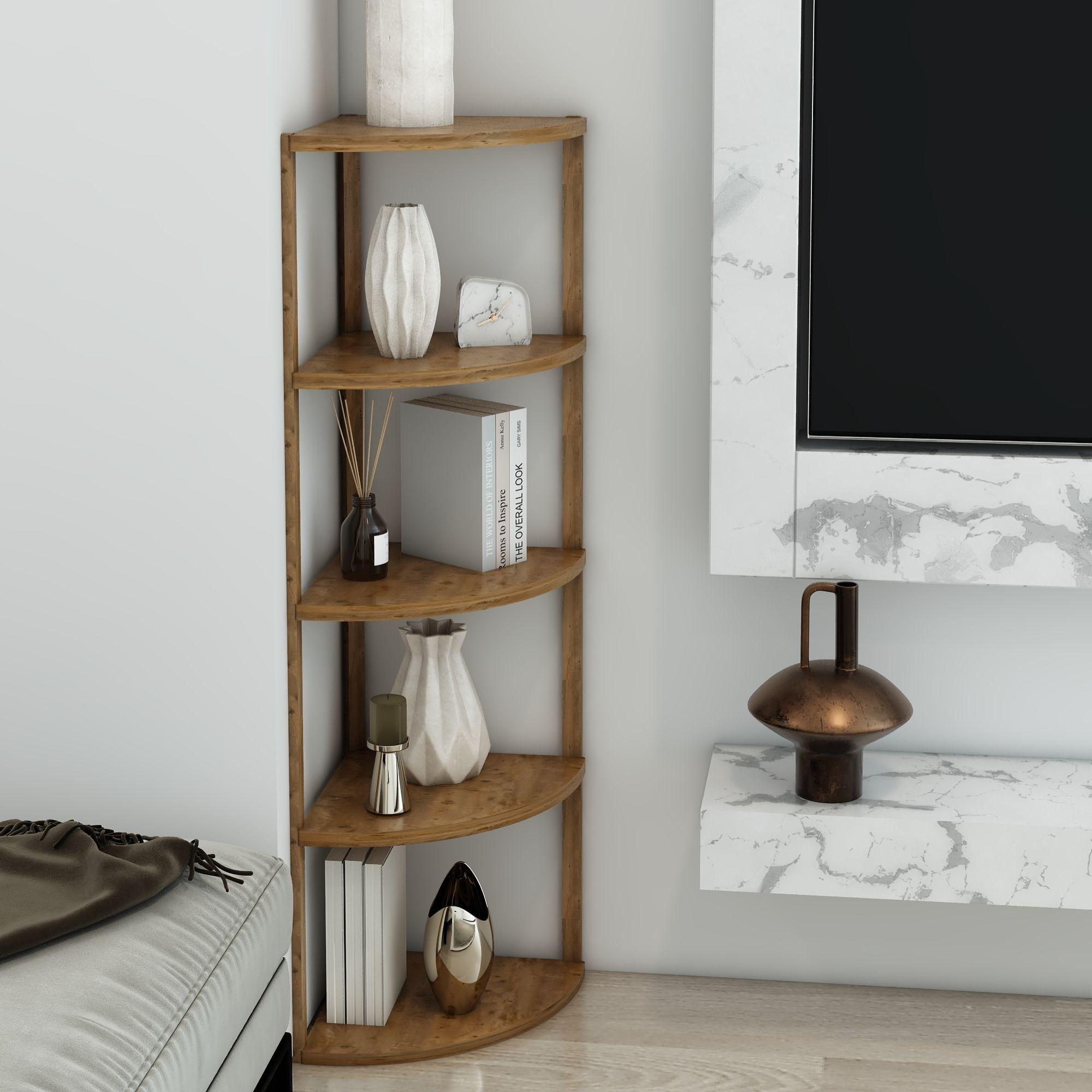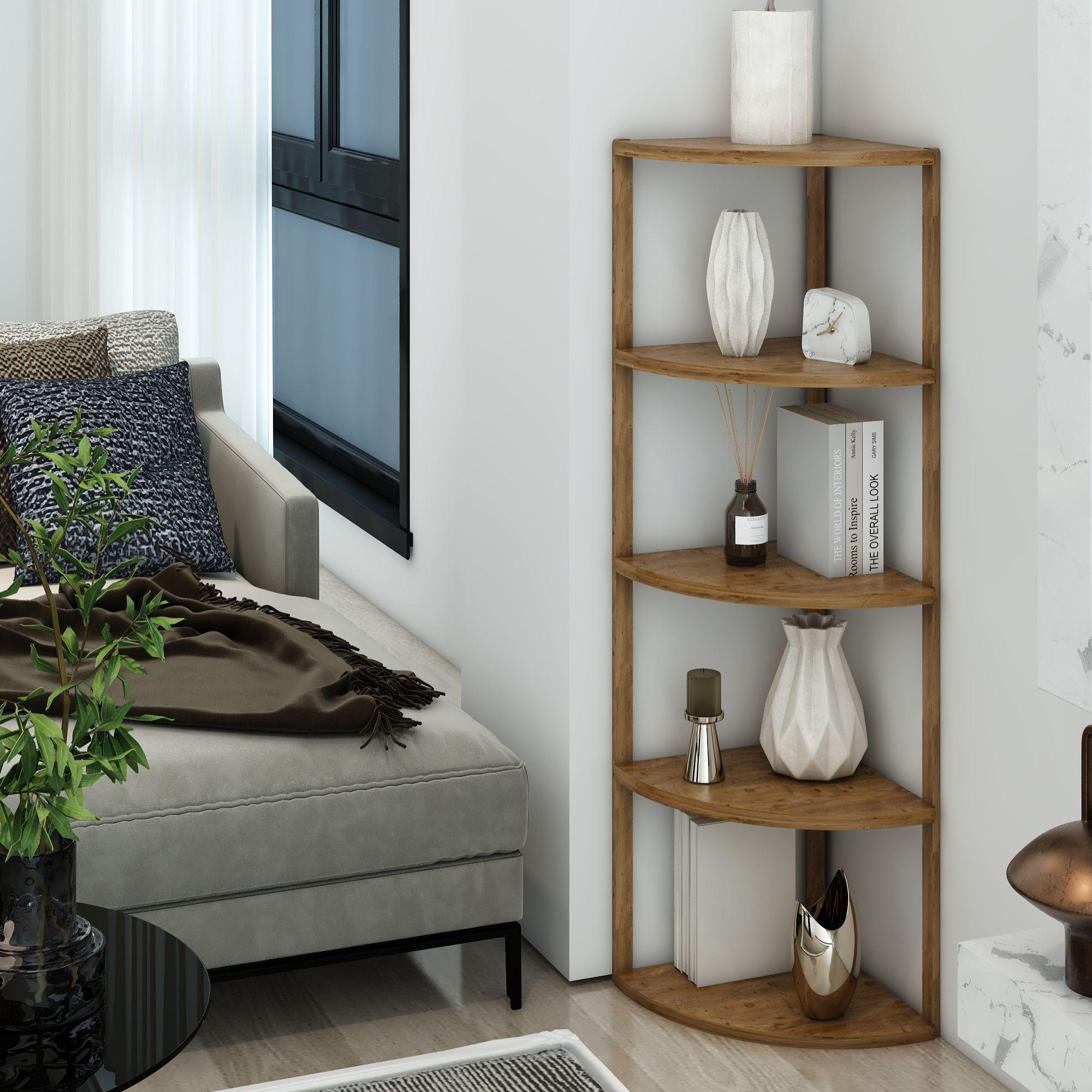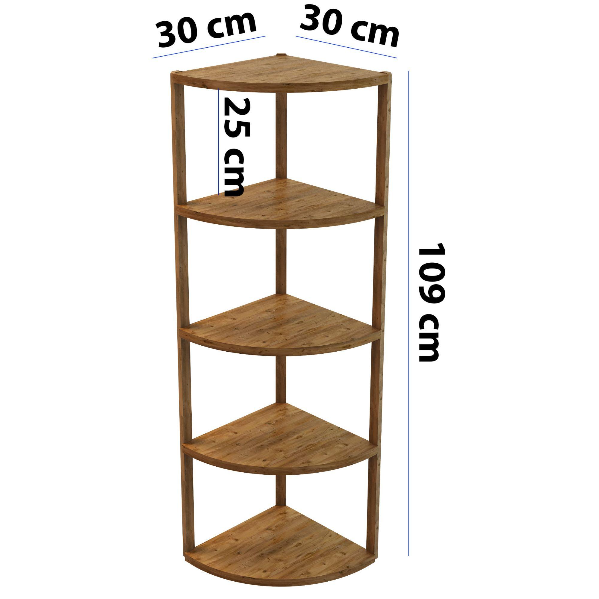 Jest Dekor Konsept Zümrüt 5 Raflı Üçgen Çok Amaçlı Ahşap Sehpa, hem fonksiyonel hem de estetik tasarımıyla evin her köşesinde kullanabileceğiniz çok yönlü bir üründür. Yüksekliği 109 cm, genişliği 30 cm olan bu sehpa, zarif yuvarlak rafları ve 25 cm aralıkları sayesinde çeşitli dekoratif eşyaları sergilemek için veya işlevsel kullanım seçenekleri sunuyor.